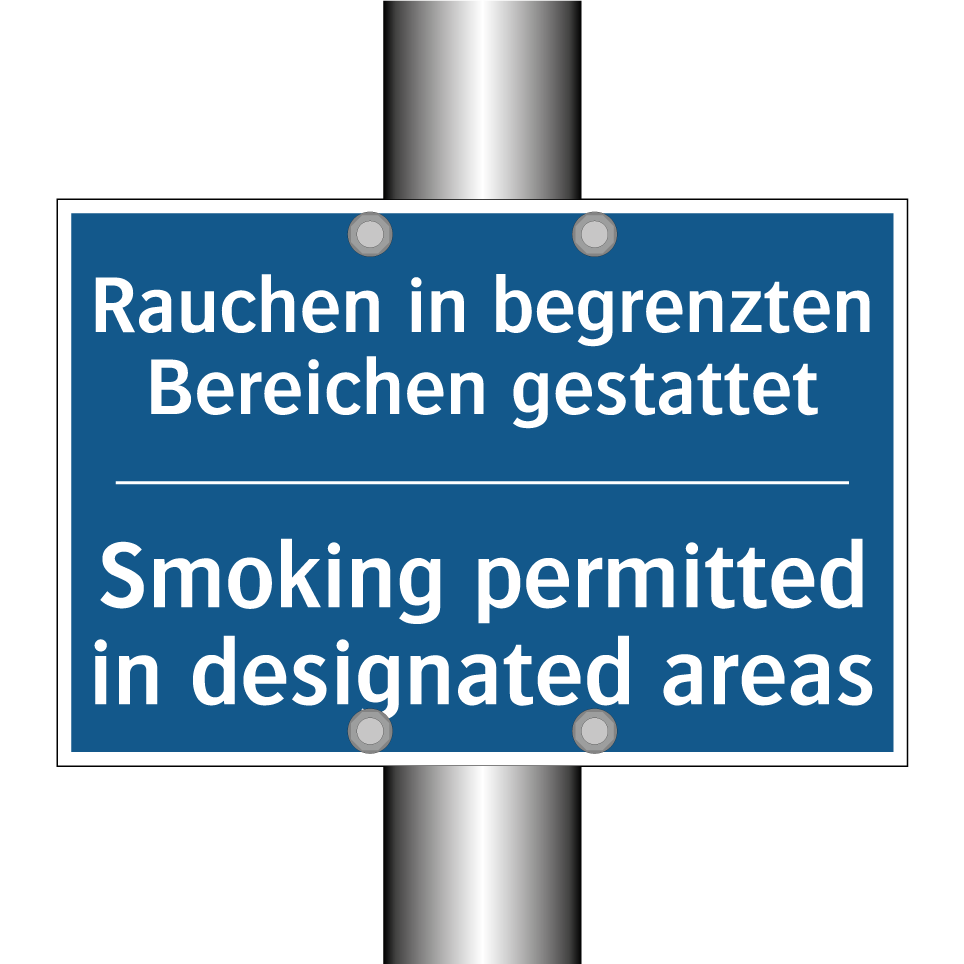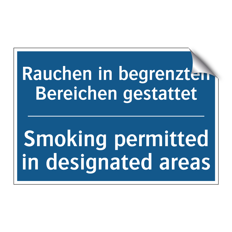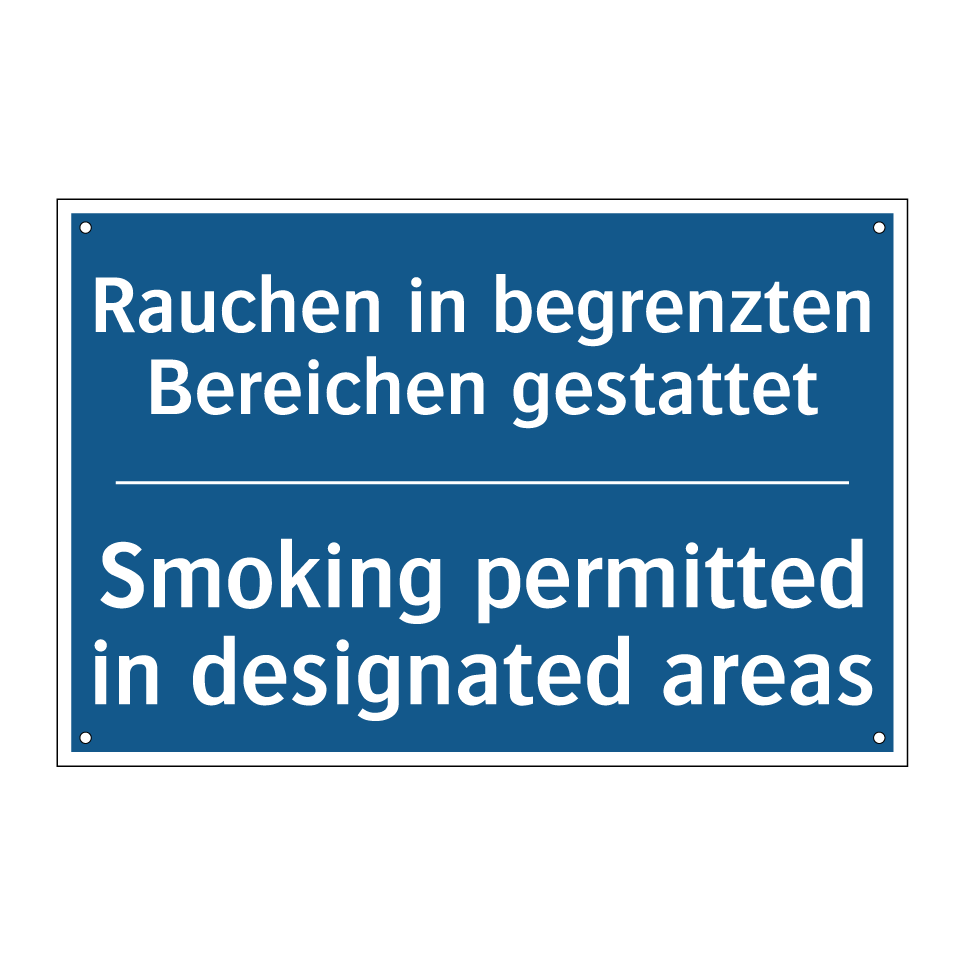 Zweisprachiges Verbotsschild mit deutschem Text Rauchen in begrenzten Bereichen gestattet und englischem Text Smoking permitted in designated areas