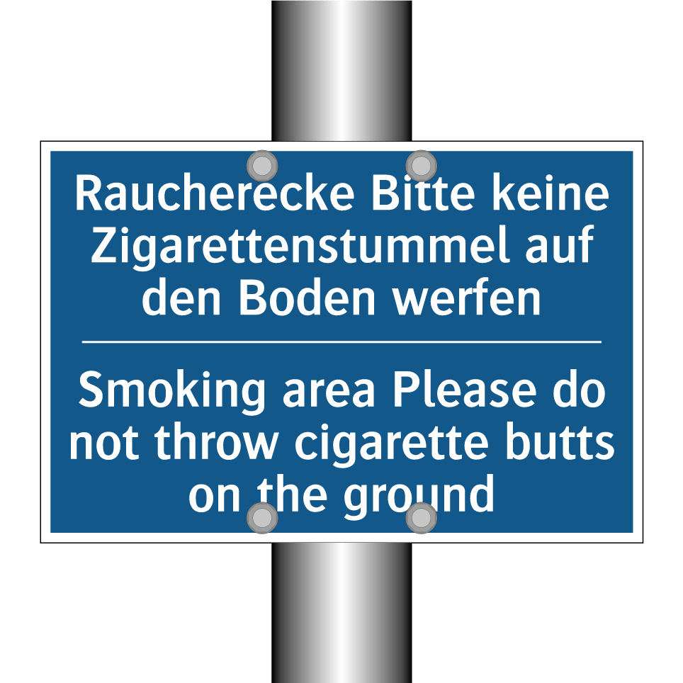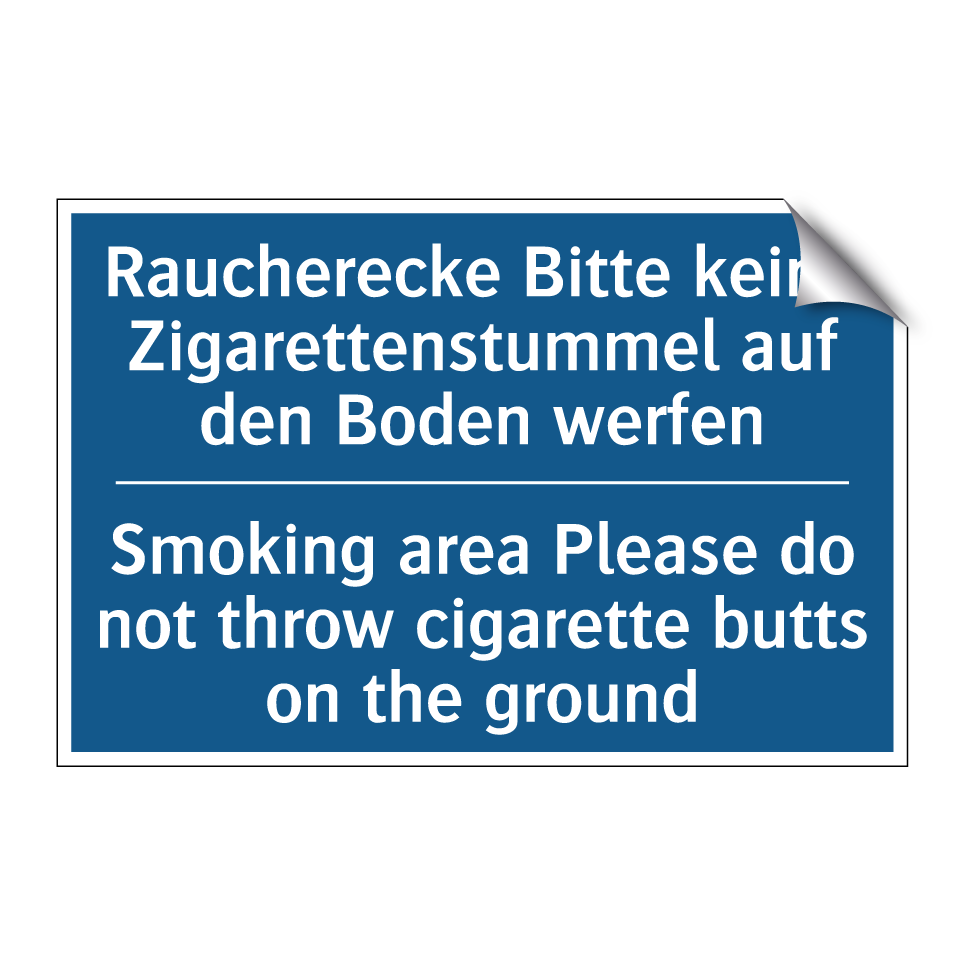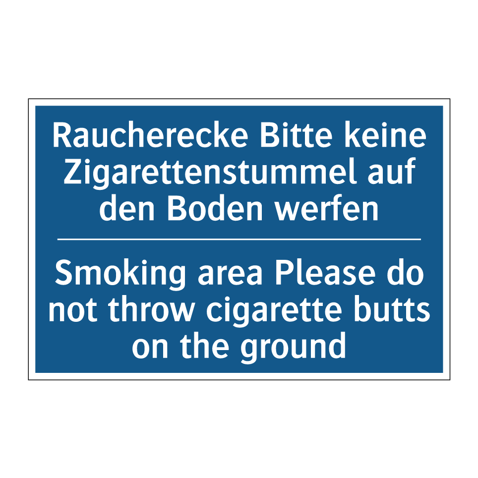 Zweisprachiges Verbotsschild mit deutschem Text Raucherecke Bitte keine Zigarettenstummel auf den Boden werfen und englischem Text Smoking area Please do not throw cigarette butts on the ground