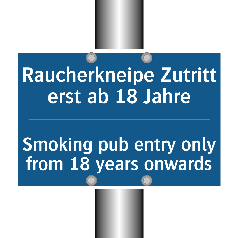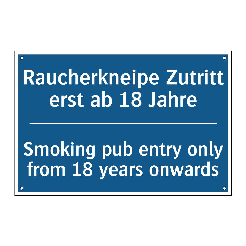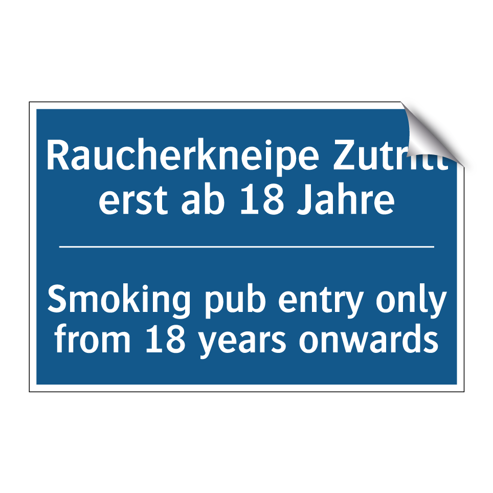 Zweisprachiges Verbotsschild mit deutschem Text Raucherkneipe Zutritt erst ab 18 Jahre und englischem Text Smoking pub entry only from 18 years onwards