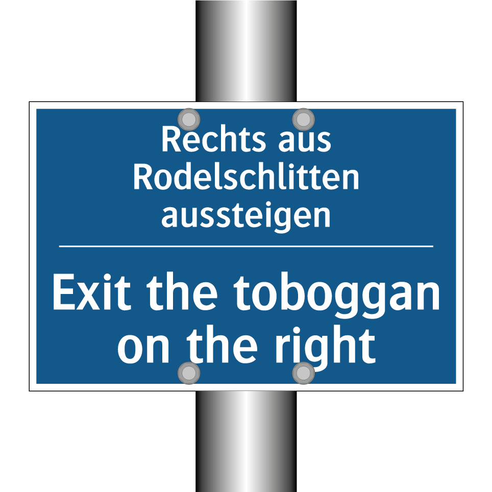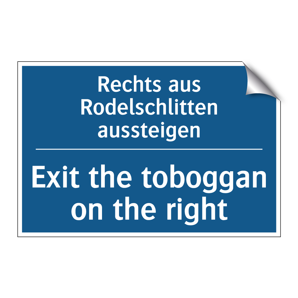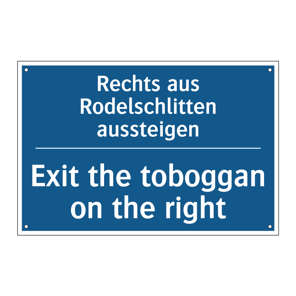Zweisprachiges Verbotsschild mit deutschem Text Rechts aus Rodelschlitten aussteigen und englischem Text Exit the toboggan on the right