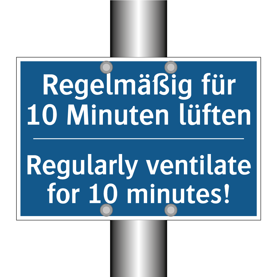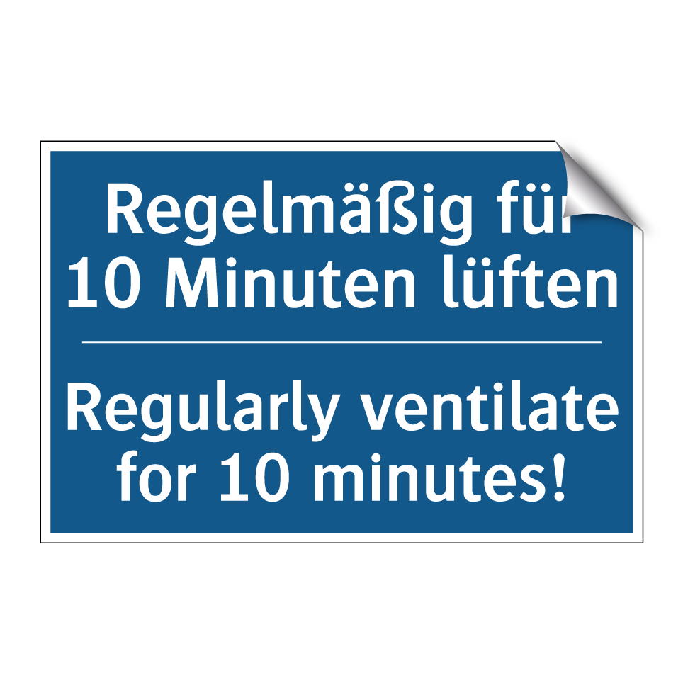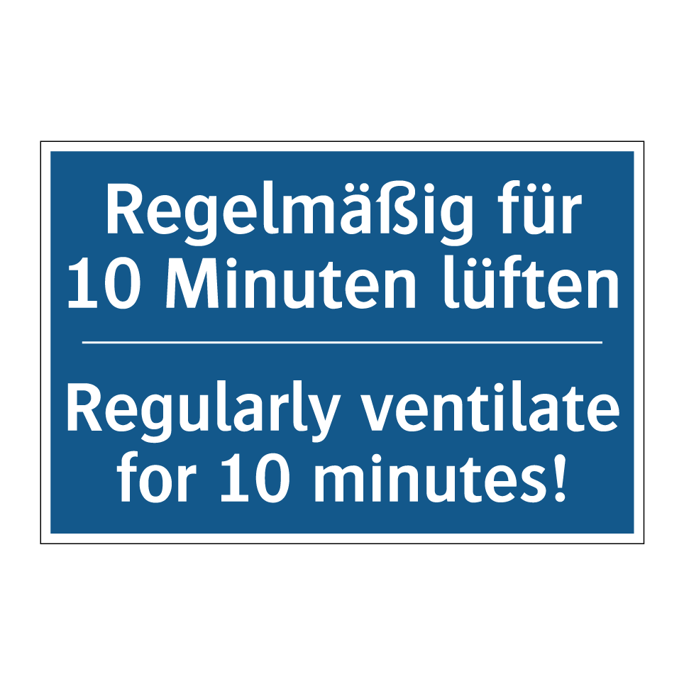 Zweisprachiges Verbotsschild mit deutschem Text Regelmäßig für 10 Minuten lüften und englischem Text Regularly ventilate for 10 minutes!