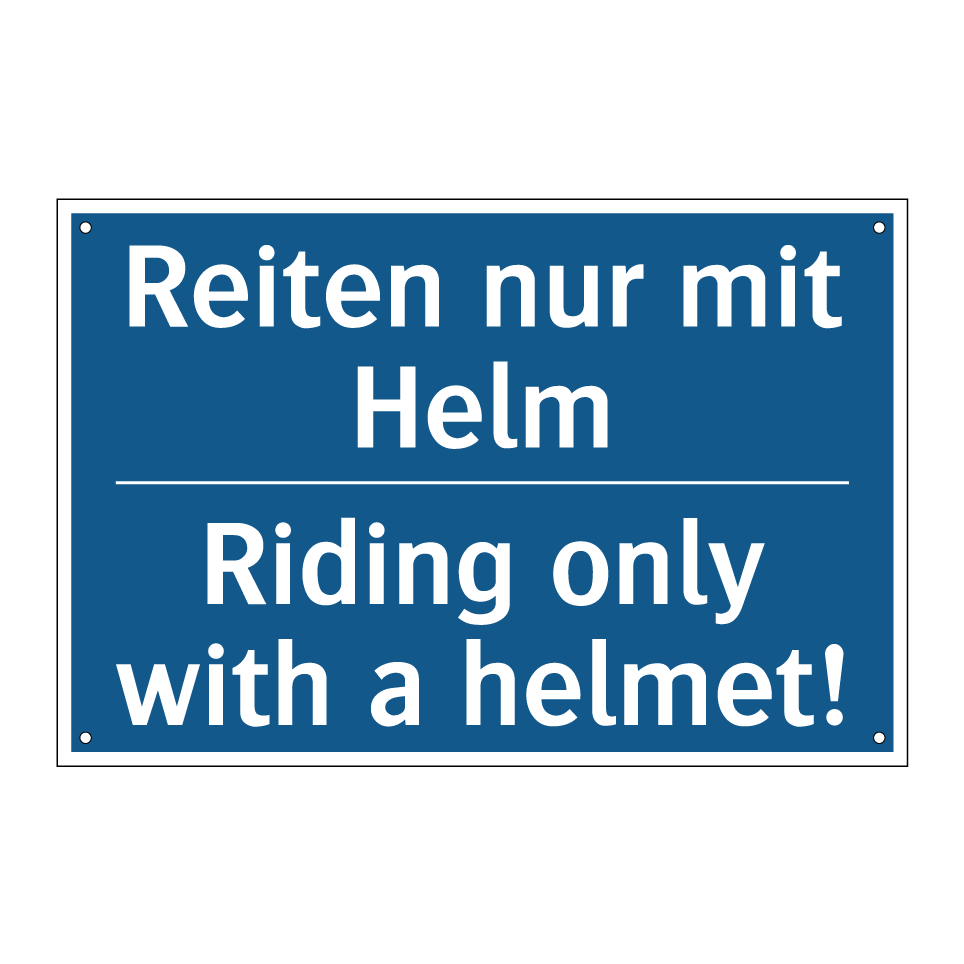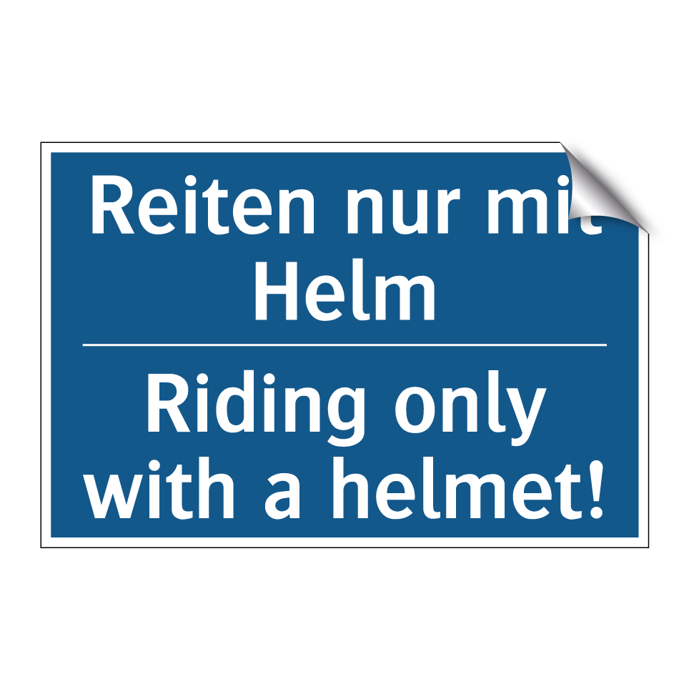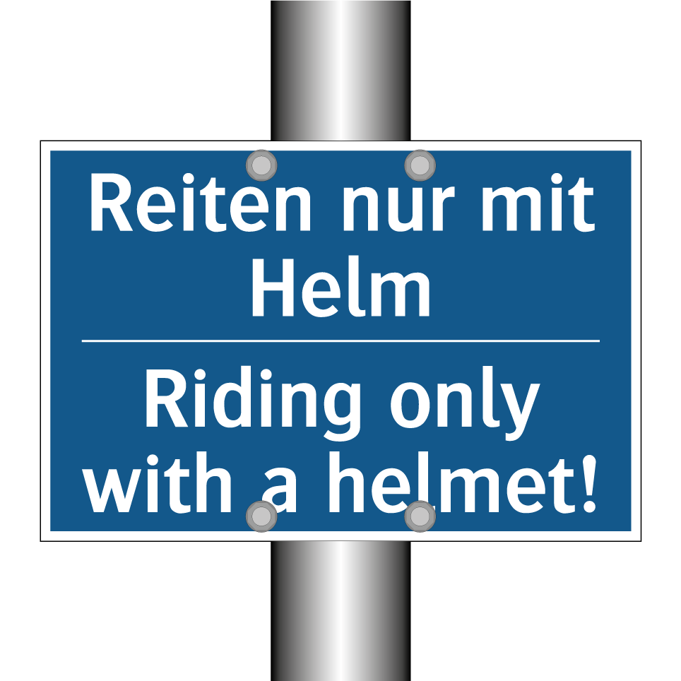 Zweisprachiges Verbotsschild mit deutschem Text Reiten nur mit Helm und englischem Text Riding only with a helmet!