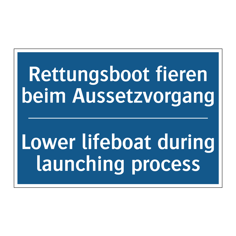 Zweisprachiges Verbotsschild mit deutschem Text Rettungsboot fieren beim Aussetzvorgang und englischem Text Lower lifeboat during launching process