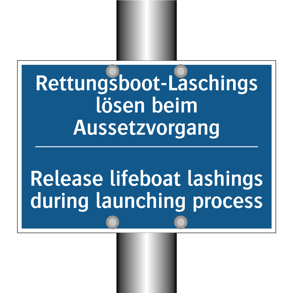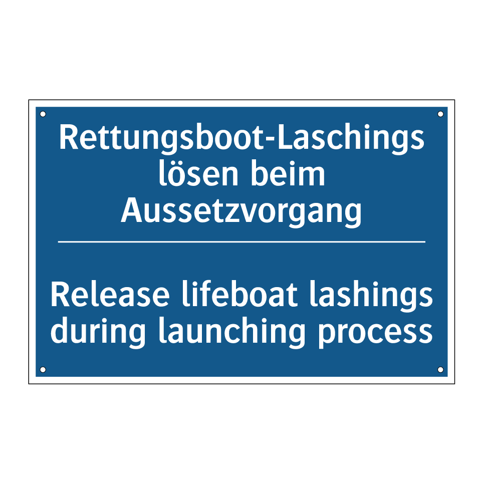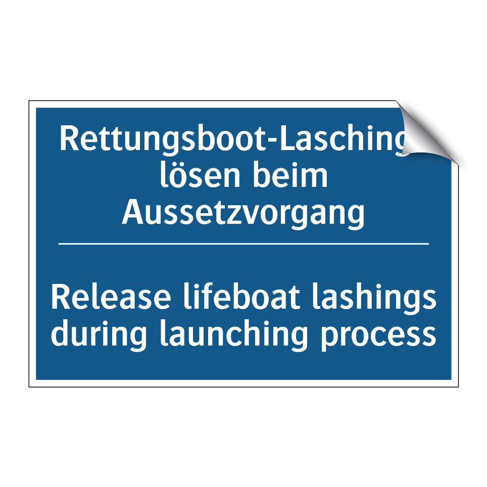 Zweisprachiges Verbotsschild mit deutschem Text Rettungsboot-Laschings lösen beim Aussetzvorgang und englischem Text Release lifeboat lashings during launching process