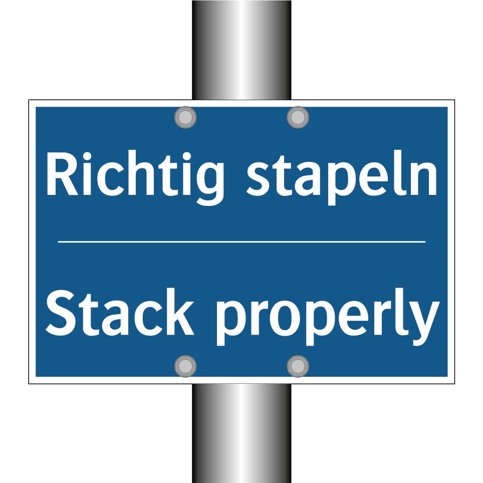 Zweisprachiges Verbotsschild mit deutschem Text Richtig stapeln und englischem Text Stack properly