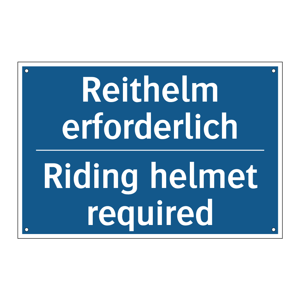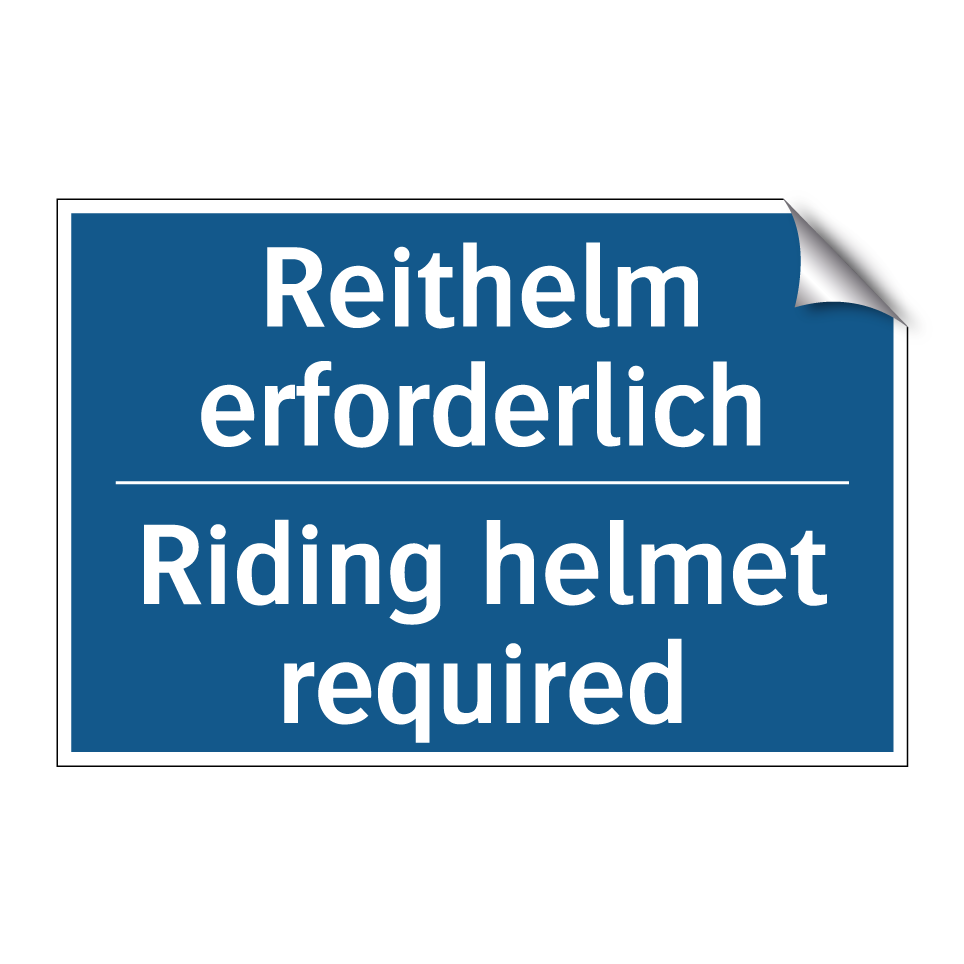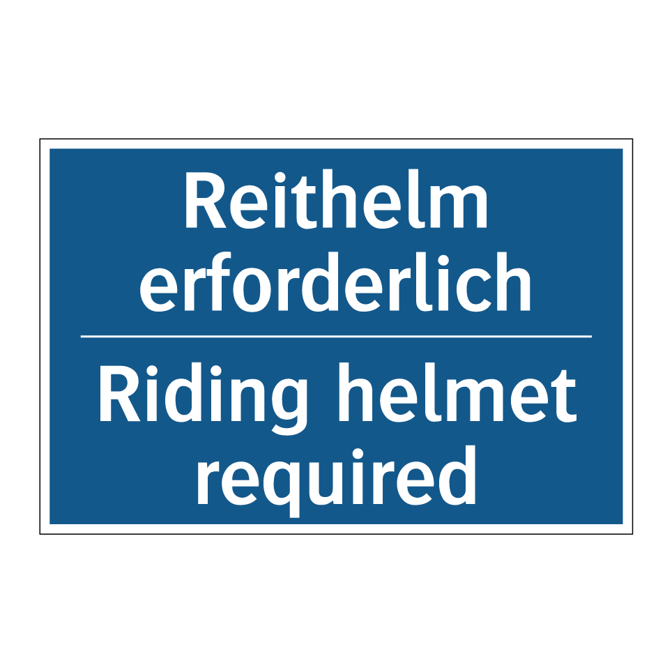 Zweisprachiges Verbotsschild mit deutschem Text Reithelm erforderlich und englischem Text Riding helmet required