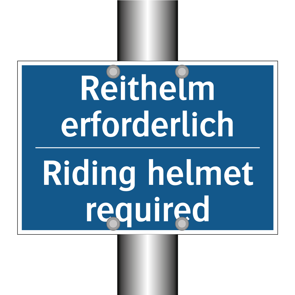 Diese Gebotsschild mit blauem Hintergrund und weißer Schrift ist ideal für Reitställe, Reitschulen und Pferdehöfe. Sie weist darauf hin, dass das Tragen eines Reithelms obligatorisch ist, um die Sicherheit der Reiter zu gewährleisten. Die zweisprachige Beschriftung auf Deutsch und Englisch macht sie besonders nützlich in internationalen Umgebungen oder an Orten mit Touristenverkehr. Diese Sicherheitsmaßnahme kann an Eingängen, in Umkleideräumen oder direkt in der Reithalle angebracht werden, um sicherzustellen, dass alle Reiter die Vorschriften verstehen und befolgen. Die klare und deutliche Darstellung der Anweisung fördert die Einhaltung der Sicherheitsstandards und minimiert das Unfallrisiko.