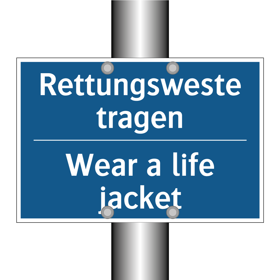 Zweisprachiges Verbotsschild mit deutschem Text Rettungsweste tragen und englischem Text Wear a life jacket