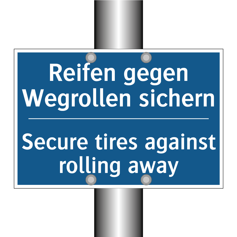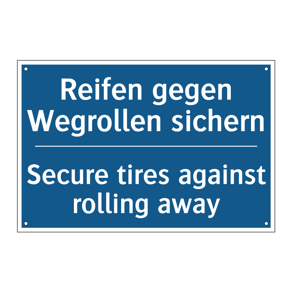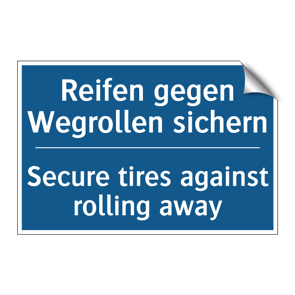 Zweisprachiges Verbotsschild mit deutschem Text Reifen gegen Wegrollen sichern und englischem Text Secure tires against rolling away
