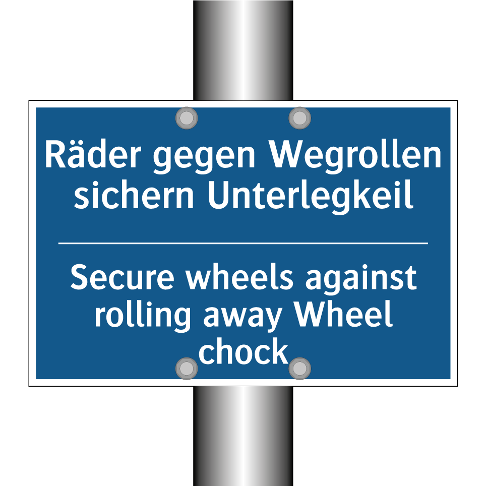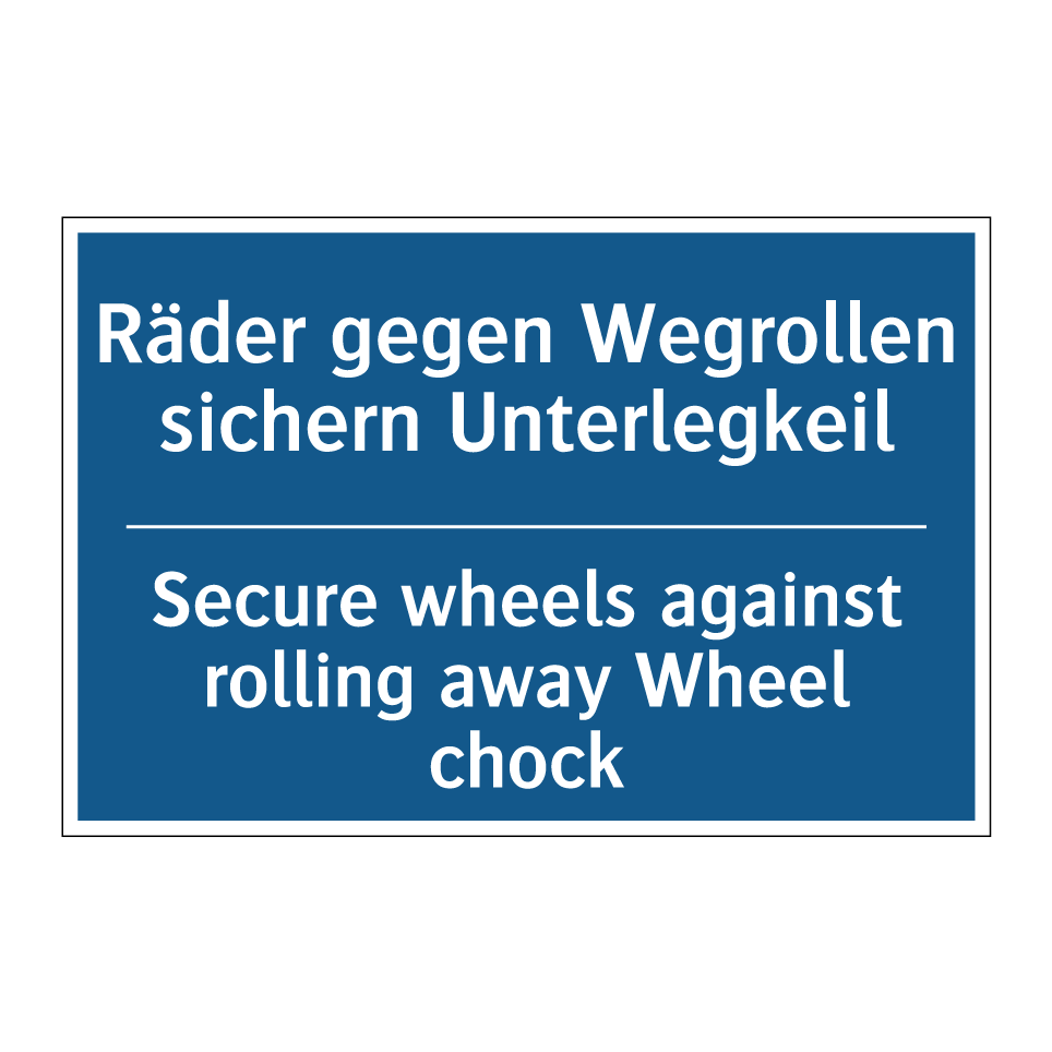 Zweisprachiges Verbotsschild mit deutschem Text Räder gegen Wegrollen sichern Unterlegkeil und englischem Text Secure wheels against rolling away Wheel chock