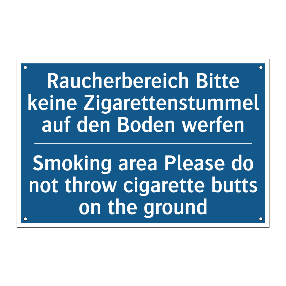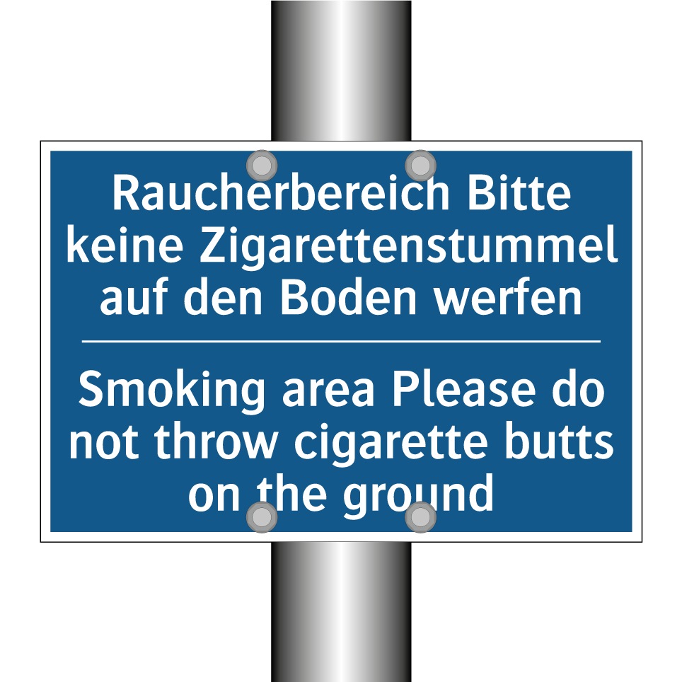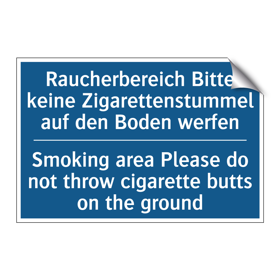 Zweisprachiges Verbotsschild mit deutschem Text Raucherbereich Bitte keine Zigarettenstummel auf den Boden werfen und englischem Text Smoking area Please do not throw cigarette butts on the ground