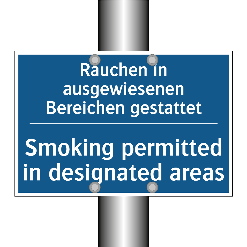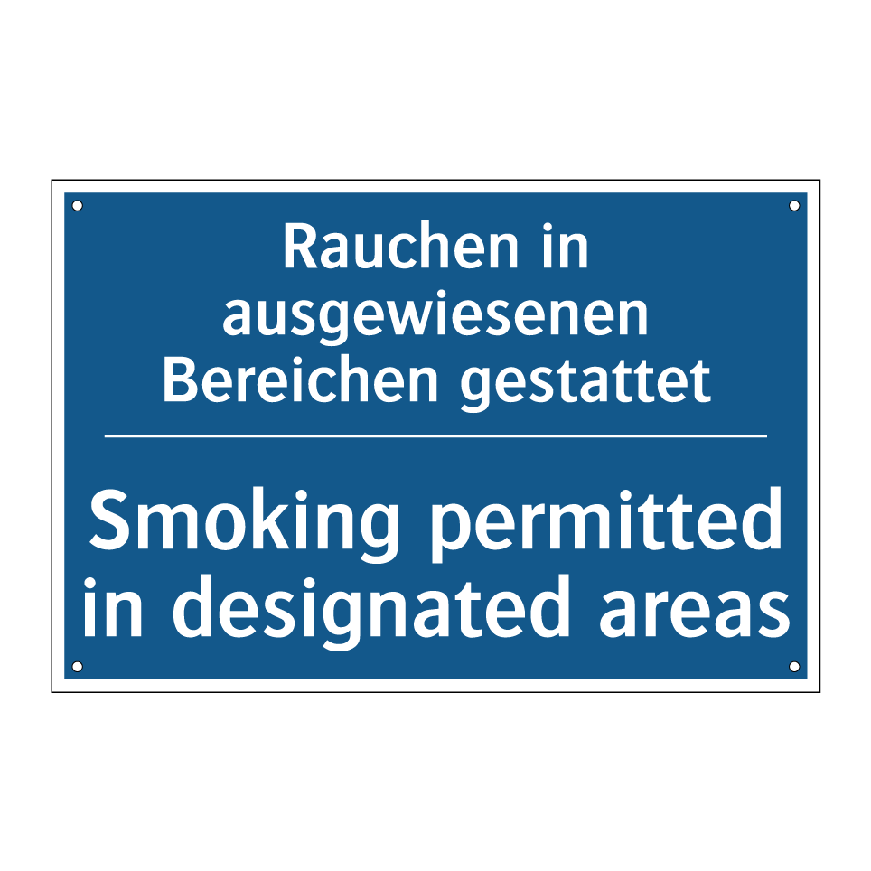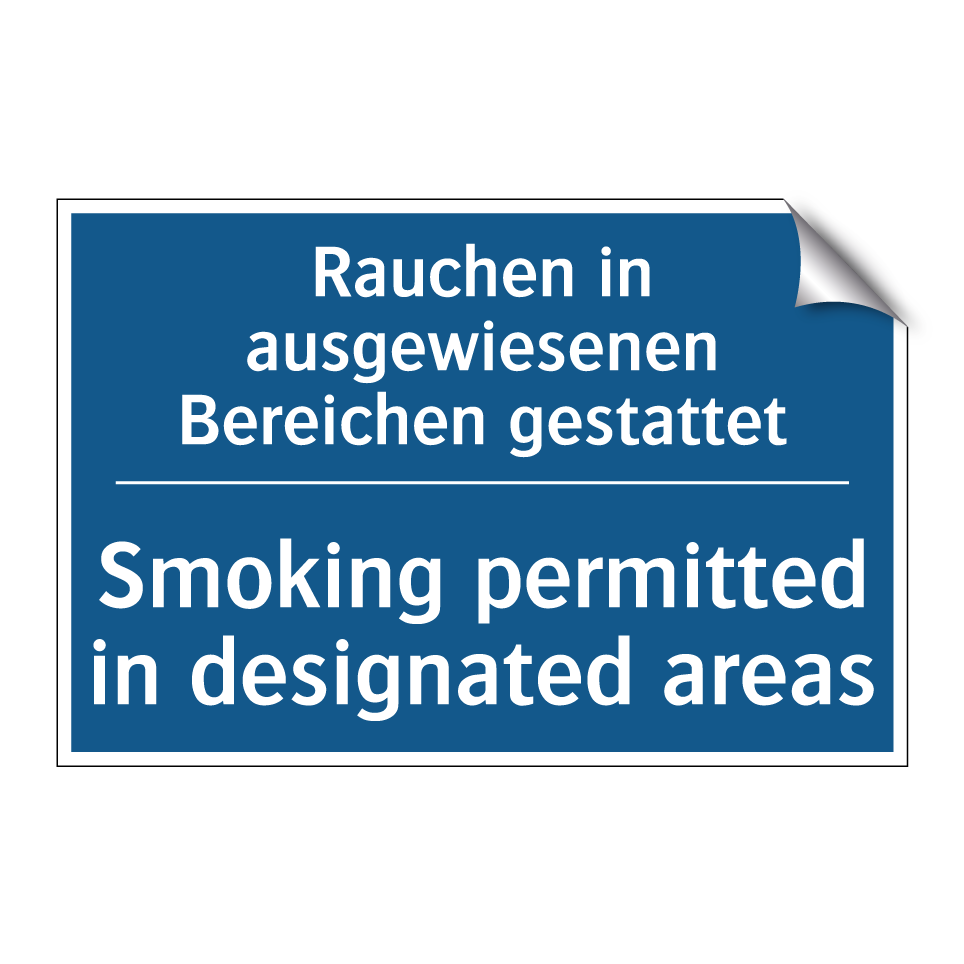 Zweisprachiges Verbotsschild mit deutschem Text Rauchen in ausgewiesenen Bereichen gestattet und englischem Text Smoking permitted in designated areas