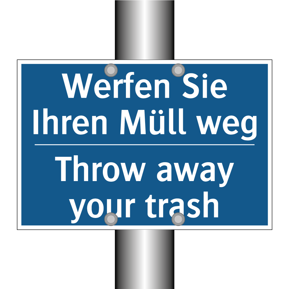 Diese Gebotsschild ist ideal für den Einsatz in öffentlichen Bereichen, um Sauberkeit und Ordnung zu fördern. Mit ihrer klaren Botschaft auf blauem Hintergrund und der zweisprachigen Beschriftung in Deutsch und Englisch, ermutigt sie Passanten, ihren Abfall ordnungsgemäß zu entsorgen. Die zweisprachige Gestaltung macht sie besonders geeignet für internationale Umgebungen wie Flughäfen, Bahnhöfe oder touristische Attraktionen, wo Besucher aus verschiedenen Ländern zusammenkommen. Diese Gebotsschild kann an strategischen Orten wie Eingängen, Gehwegen oder in der Nähe von Mülleimern angebracht werden, um die Einhaltung von Sauberkeitsstandards zu unterstützen und eine angenehme Umgebung für alle zu schaffen.