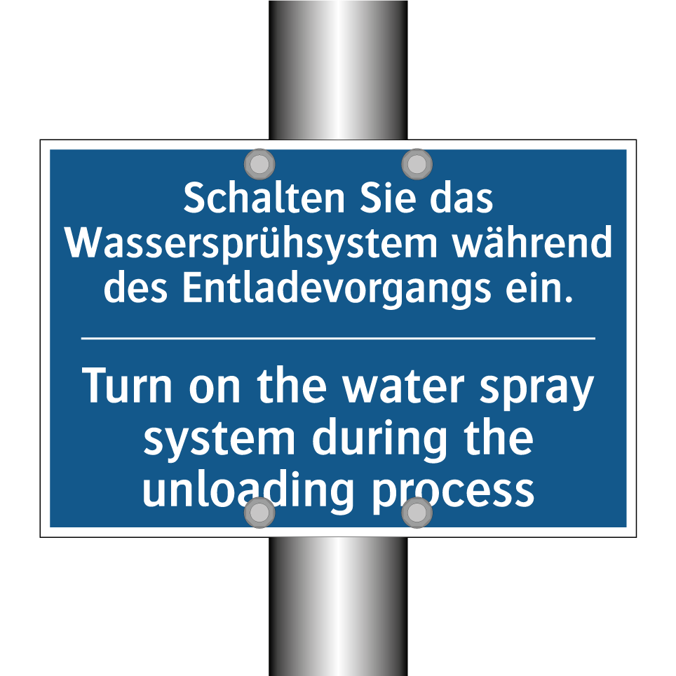 Zweisprachiges Verbotsschild mit deutschem Text Schalten Sie das Wassersprühsystem während des Entladevorgangs ein. und englischem Text Turn on the water spray system during the unloading process