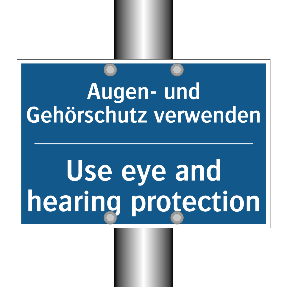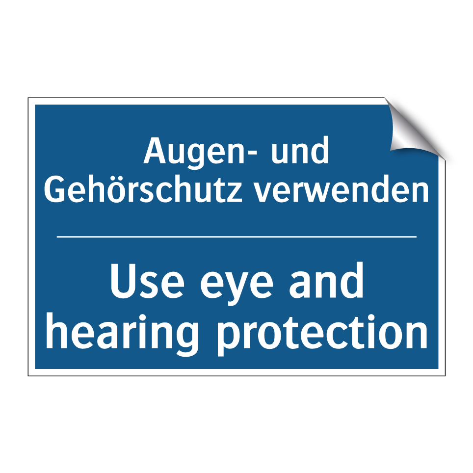 Zweisprachiges Verbotsschild mit deutschem Text Augen- und Gehörschutz verwenden und englischem Text Use eye and hearing protection