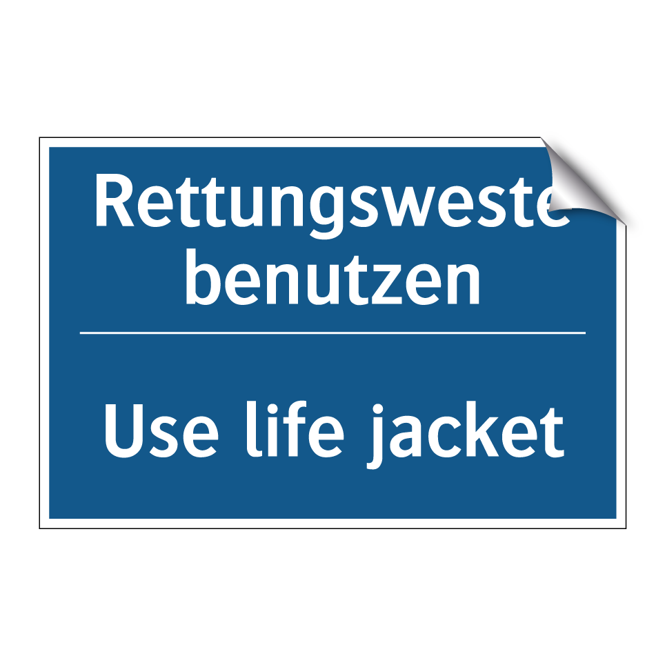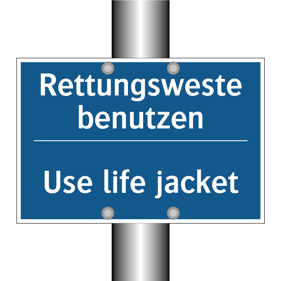 Zweisprachiges Verbotsschild mit deutschem Text Rettungsweste benutzen und englischem Text Use life jacket