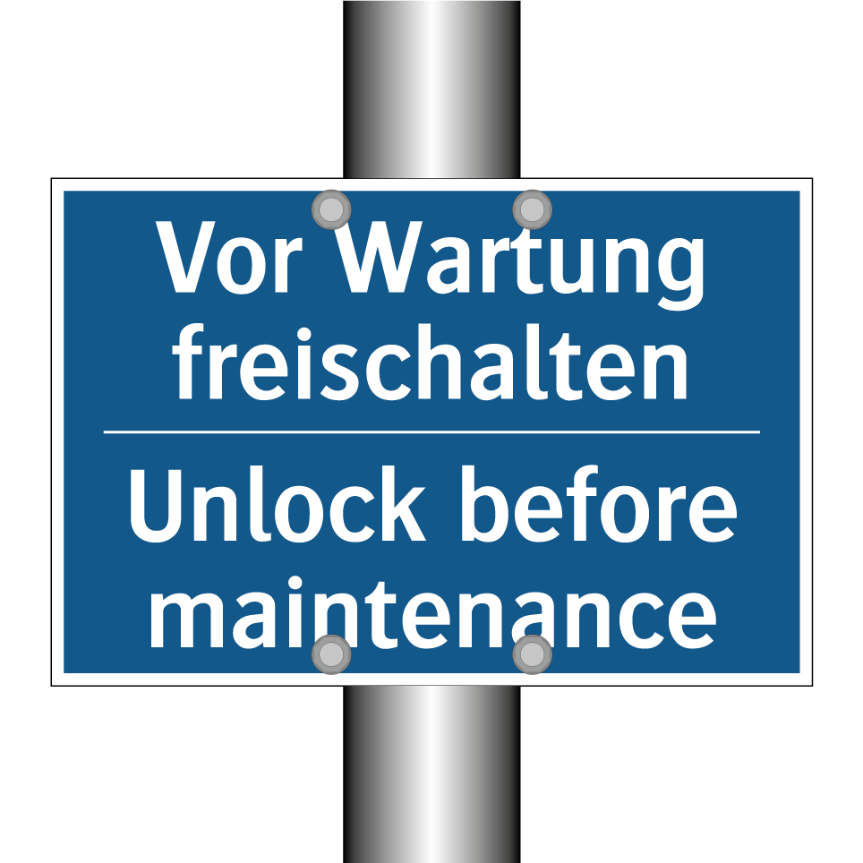 Zweisprachiges Verbotsschild mit deutschem Text Vor Wartung freischalten und englischem Text Unlock before maintenance