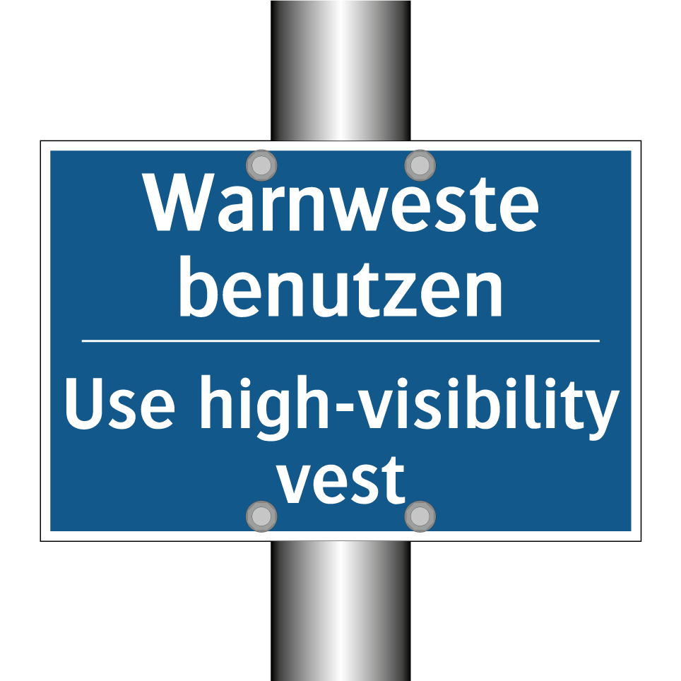 Diese Gebotsschild mit blauem Hintergrund und weißer Schrift ist ideal für den Einsatz in Bereichen, in denen das Tragen einer Warnweste erforderlich ist. Dank der zweisprachigen Beschriftung auf Deutsch und Englisch eignet sich das Schild hervorragend für internationale Arbeitsumgebungen und sorgt für klare Kommunikation und Sicherheit. Platzieren Sie es an Eingängen zu Baustellen, Lagerhäusern oder anderen industriellen Bereichen, um sicherzustellen, dass alle Mitarbeiter und Besucher auf die Notwendigkeit einer hohen Sichtbarkeit hingewiesen werden. Die klare und prägnante Botschaft fördert die Einhaltung von Sicherheitsvorschriften und minimiert das Risiko von Unfällen.