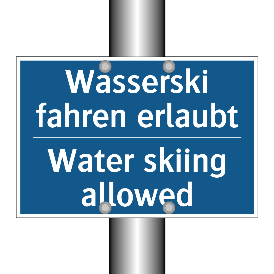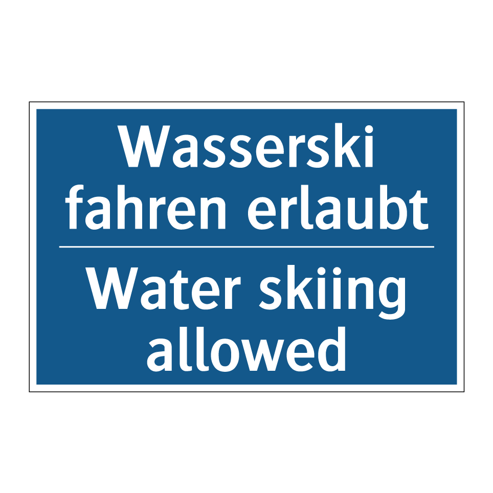 Zweisprachiges Verbotsschild mit deutschem Text Wasserski fahren erlaubt und englischem Text Water skiing allowed