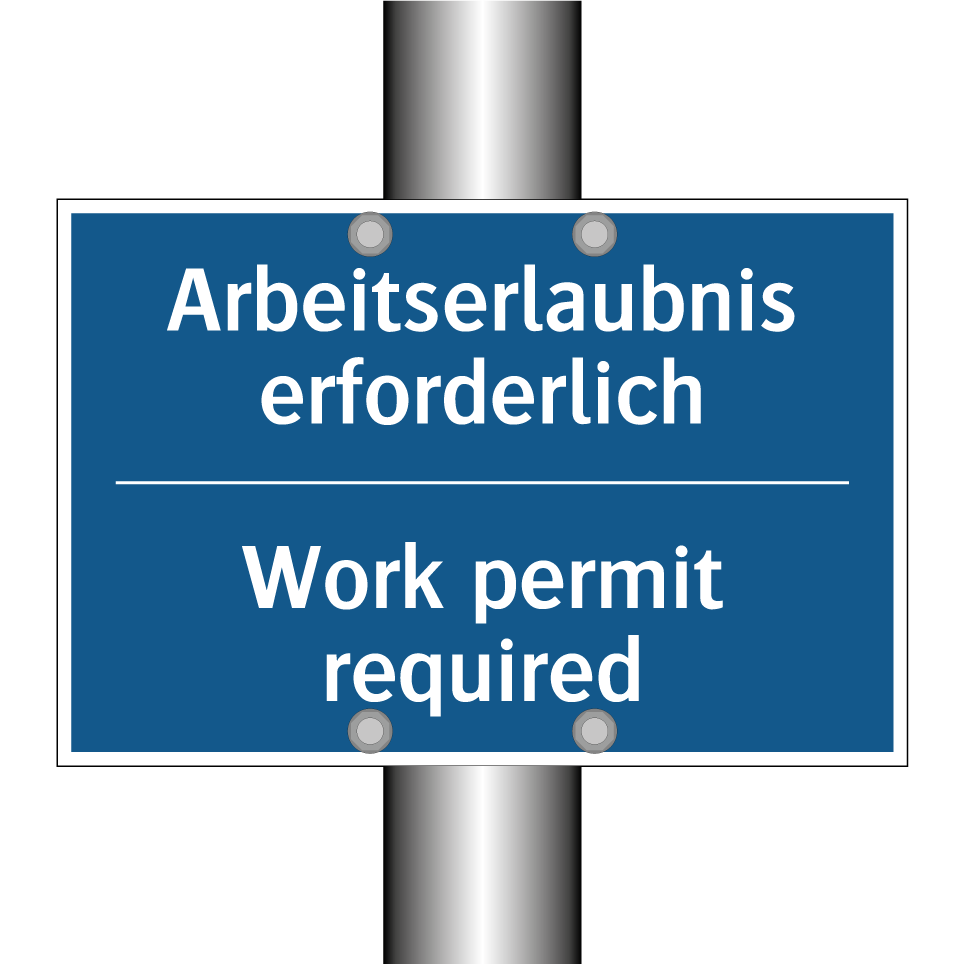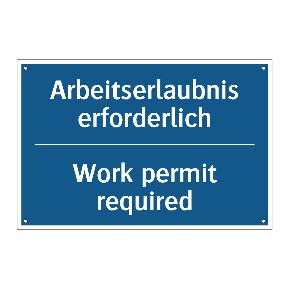 Zweisprachiges Verbotsschild mit deutschem Text Arbeitserlaubnis erforderlich und englischem Text Work permit required
