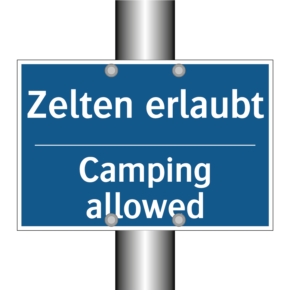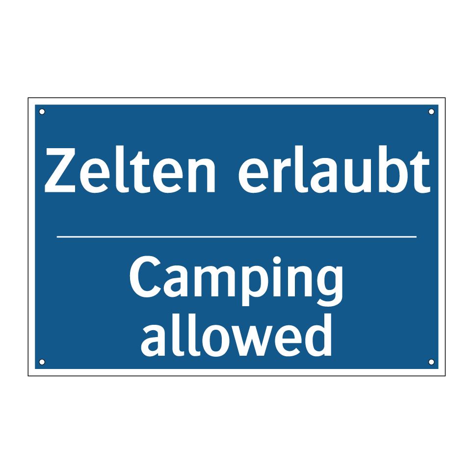 Zweisprachiges Verbotsschild mit deutschem Text Zelten erlaubt und englischem Text Camping allowed