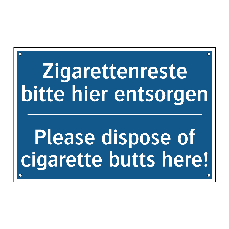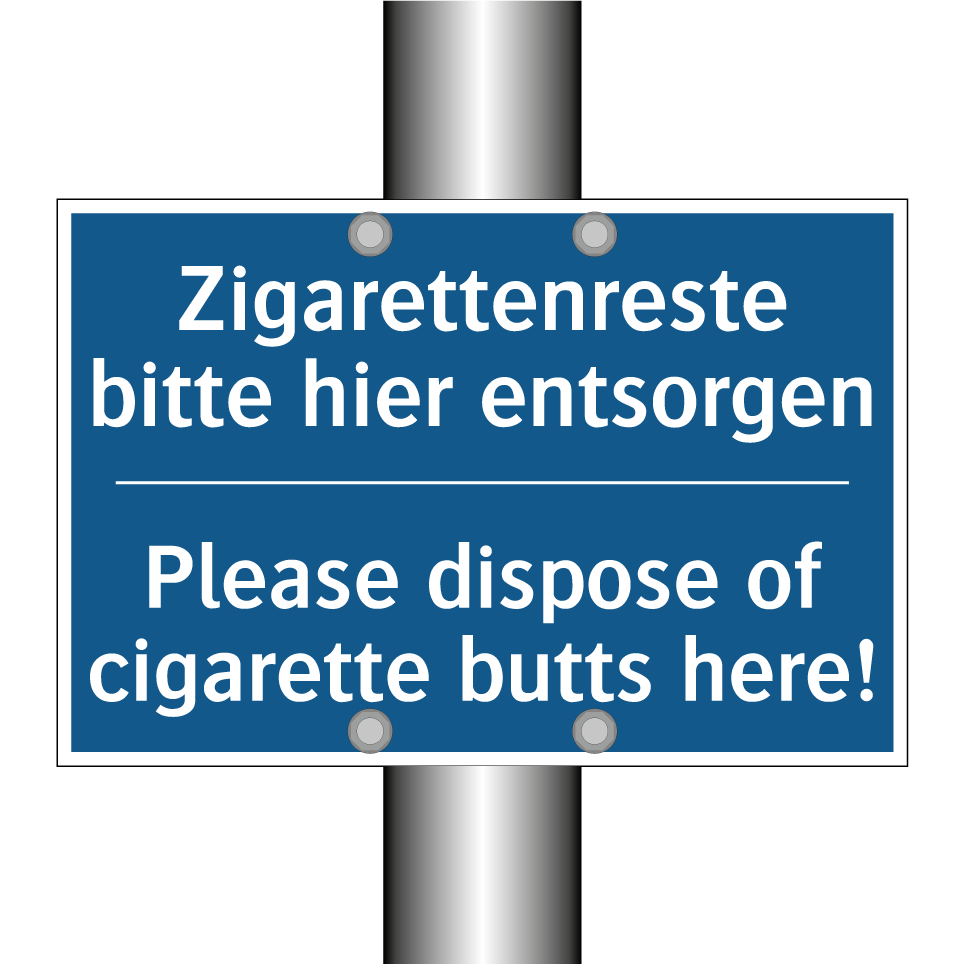 Zweisprachiges Verbotsschild mit deutschem Text Zigarettenreste bitte hier entsorgen und englischem Text Please dispose of cigarette butts here!