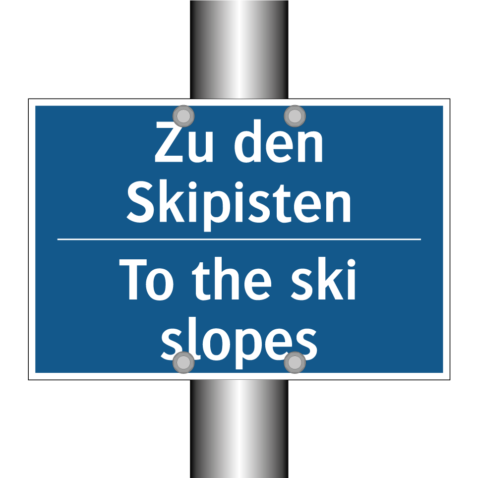 Zweisprachiges Verbotsschild mit deutschem Text Zu den Skipisten und englischem Text To the ski slopes