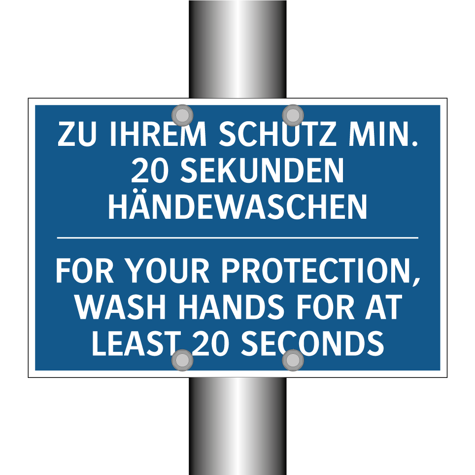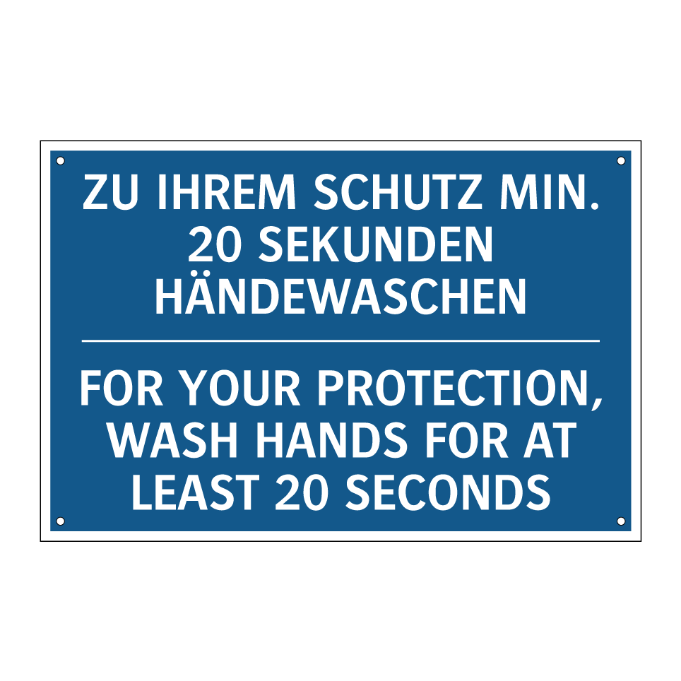 Zweisprachiges Verbotsschild mit deutschem Text ZU IHREM SCHUTZ MIN. 20 SEKUNDEN HÄNDEWASCHEN und englischem Text FOR YOUR PROTECTION, WASH HANDS FOR AT LEAST 20 SECONDS