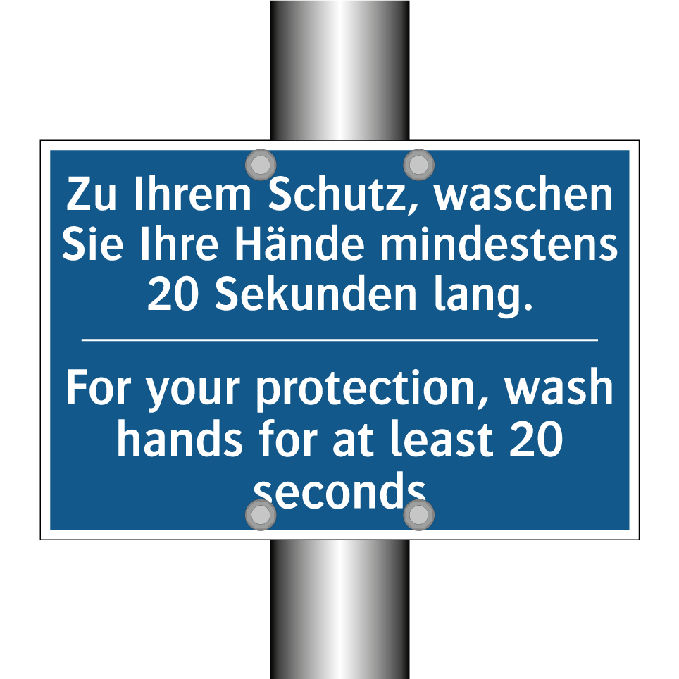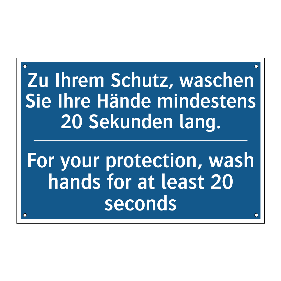 Zweisprachiges Verbotsschild mit deutschem Text Zu Ihrem Schutz, waschen Sie Ihre Hände mindestens 20 Sekunden lang. und englischem Text For your protection, wash hands for at least 20 seconds