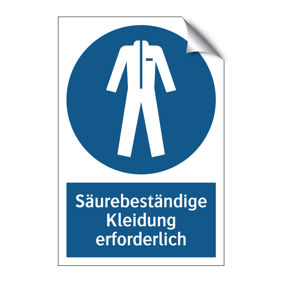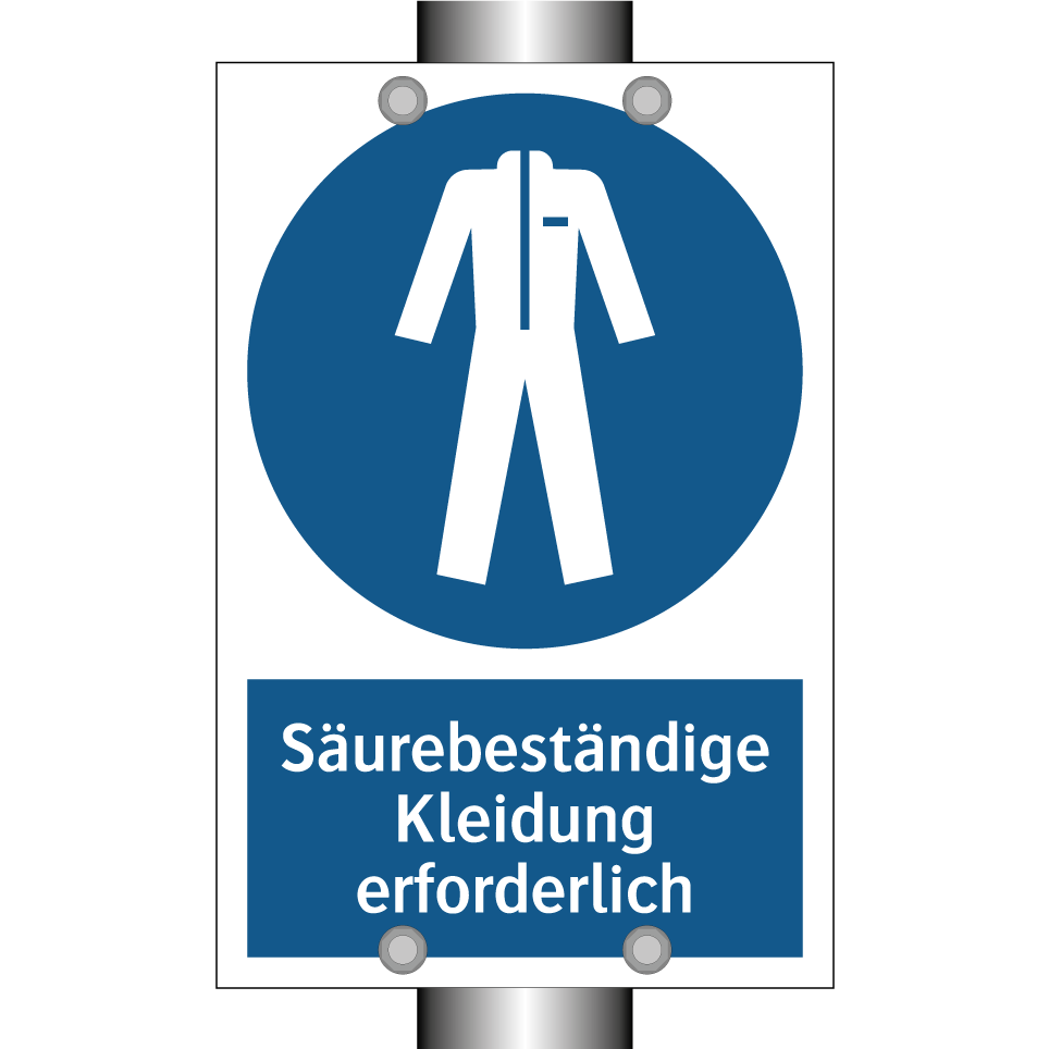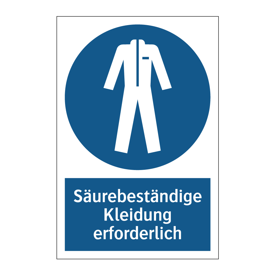 Gebotsschild mit dem Text Säurebeständige Kleidung erforderlich