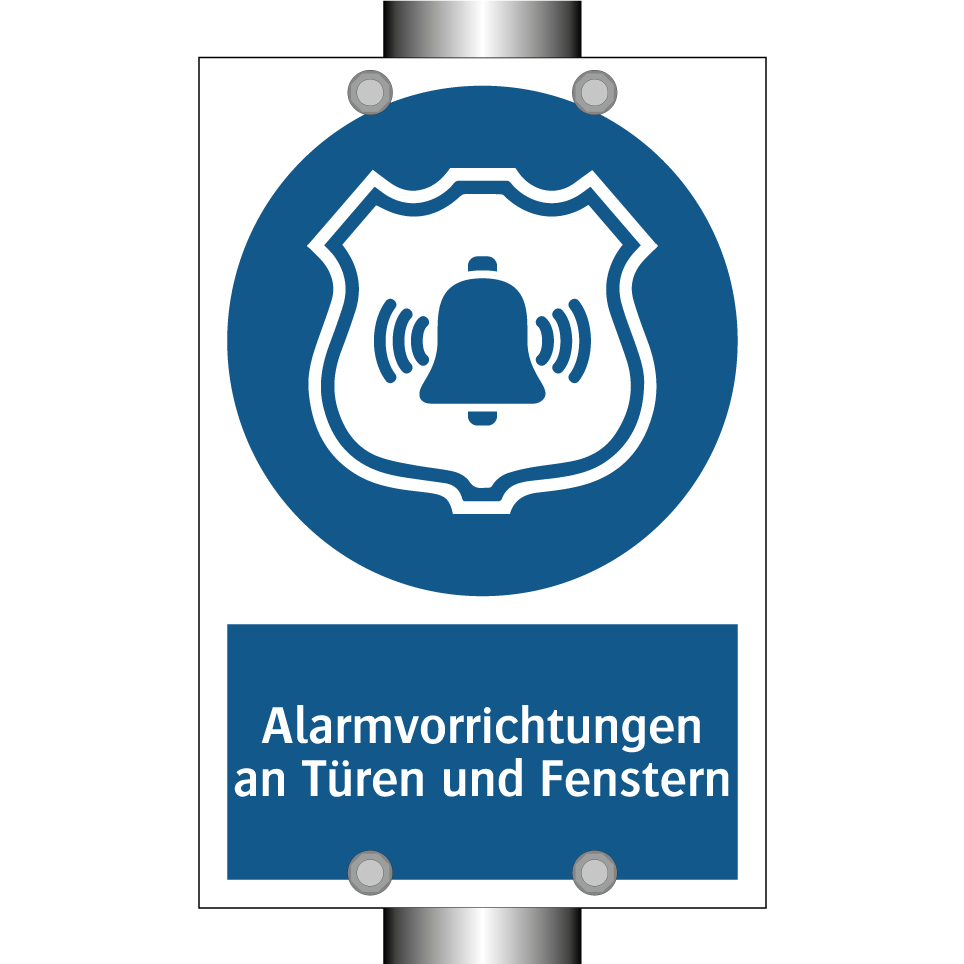 Gebotsschild mit dem Text Alarmvorrichtungen an Türen und Fenstern