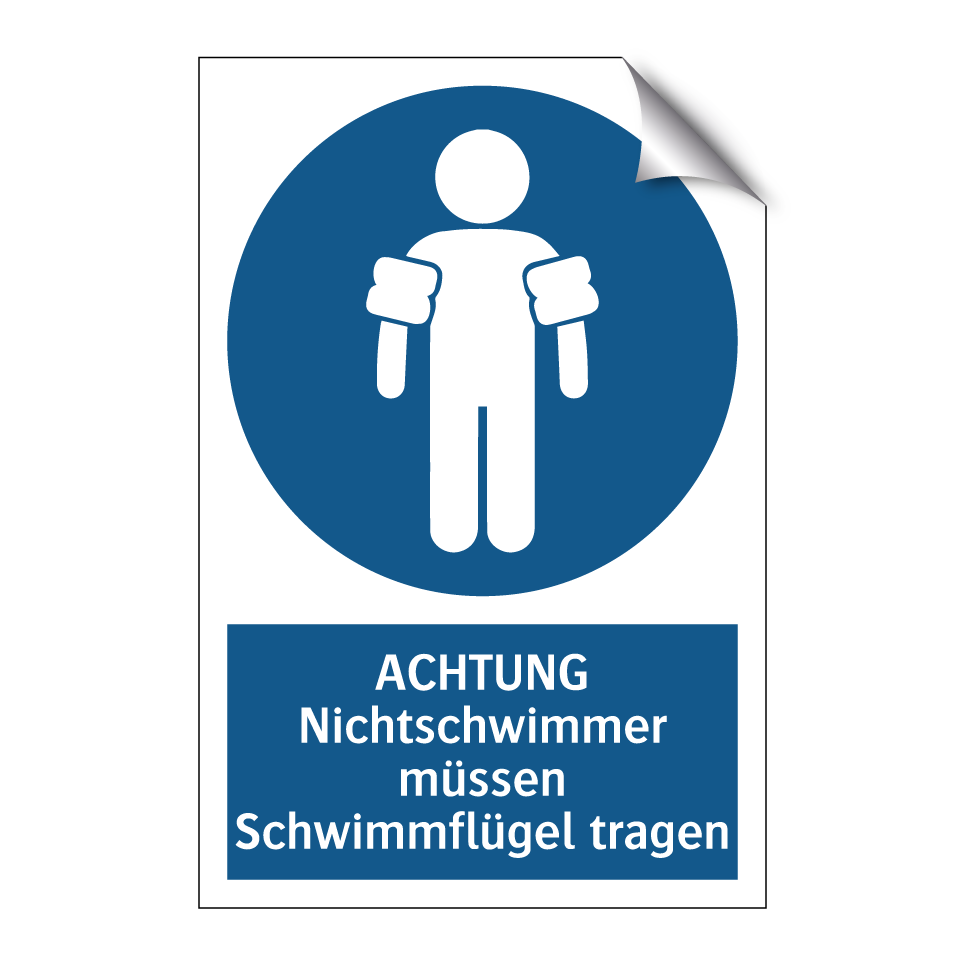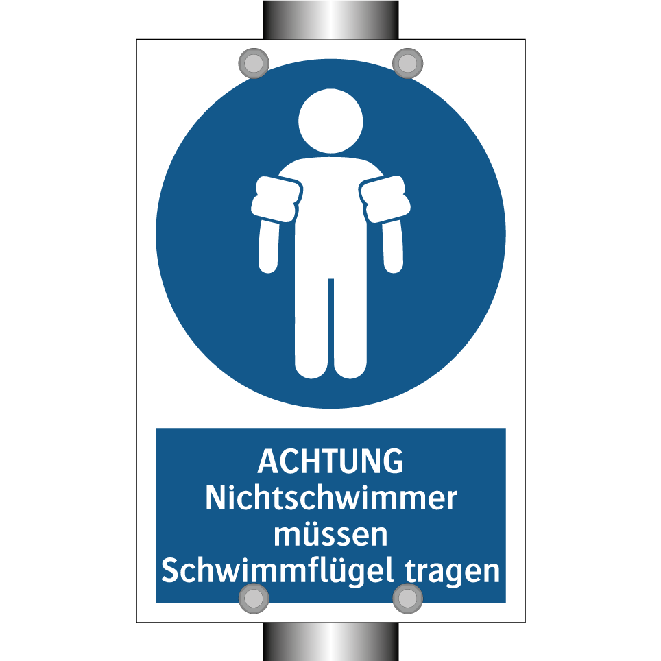 Gebotsschild mit dem Text ACHTUNG Nichtschwimmer müssen Schwimmflügel tragen
