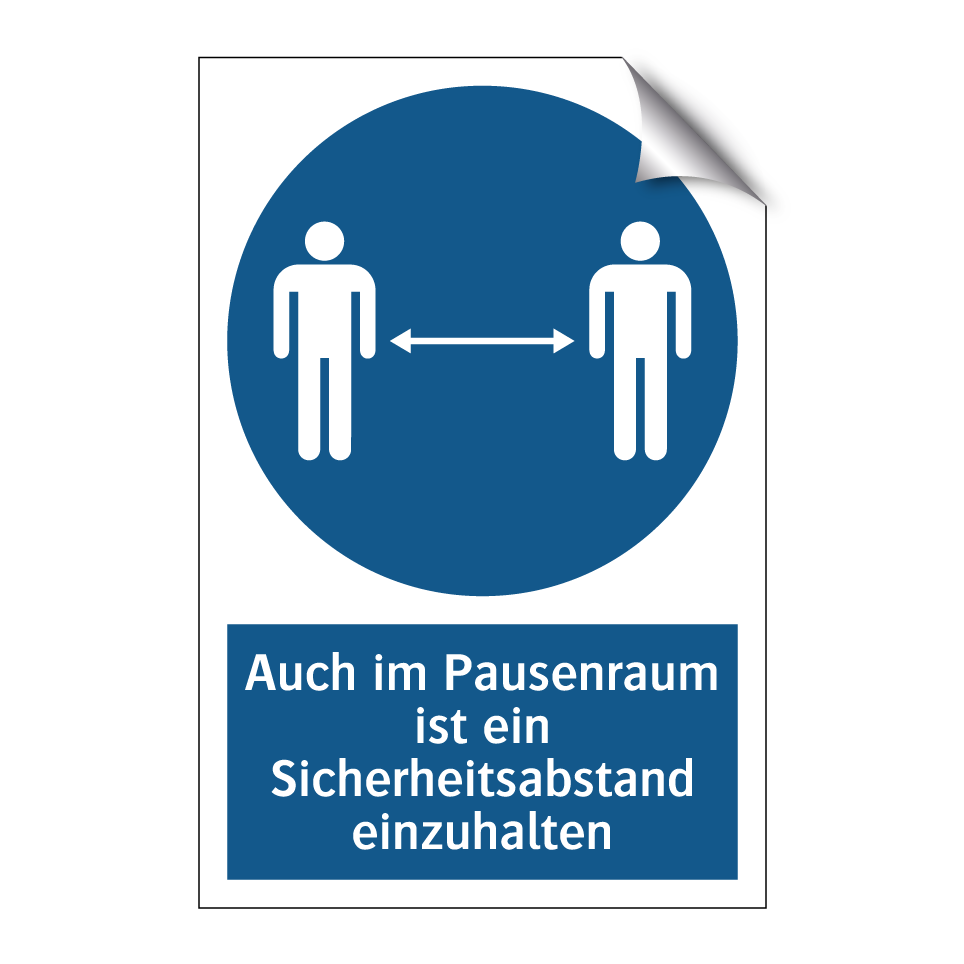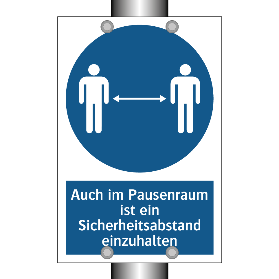Gebotsschild mit dem Text Auch im Pausenraum ist ein Sicherheitsabstand einzuhalten