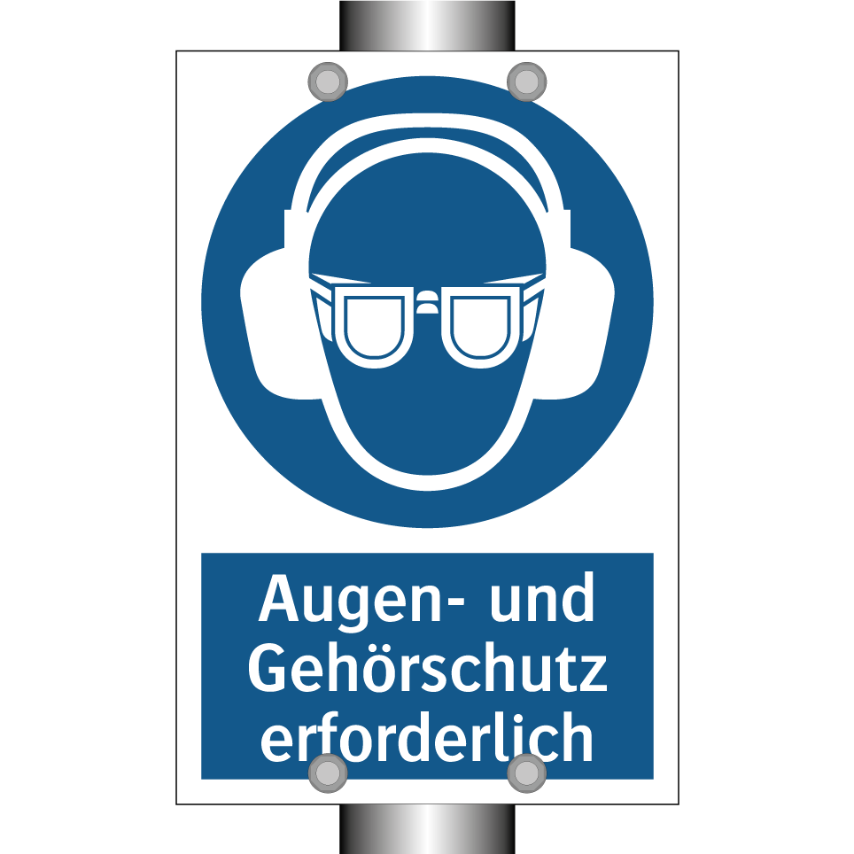 Gebotsschild mit dem Text Augen- und Gehörschutz erforderlich