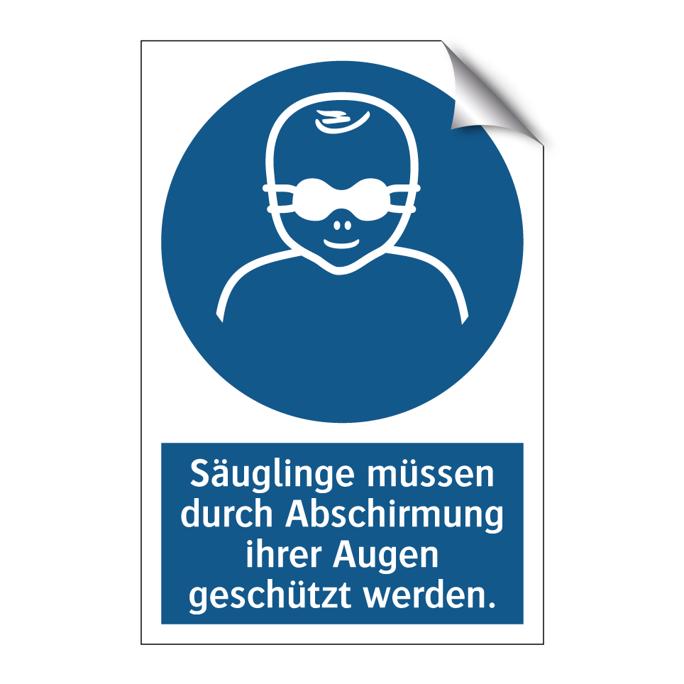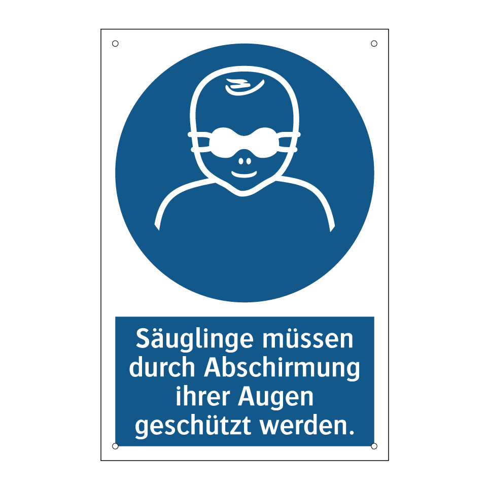Gebotsschild mit dem Text Säuglinge müssen durch Abschirmung ihrer Augen geschützt werden.
