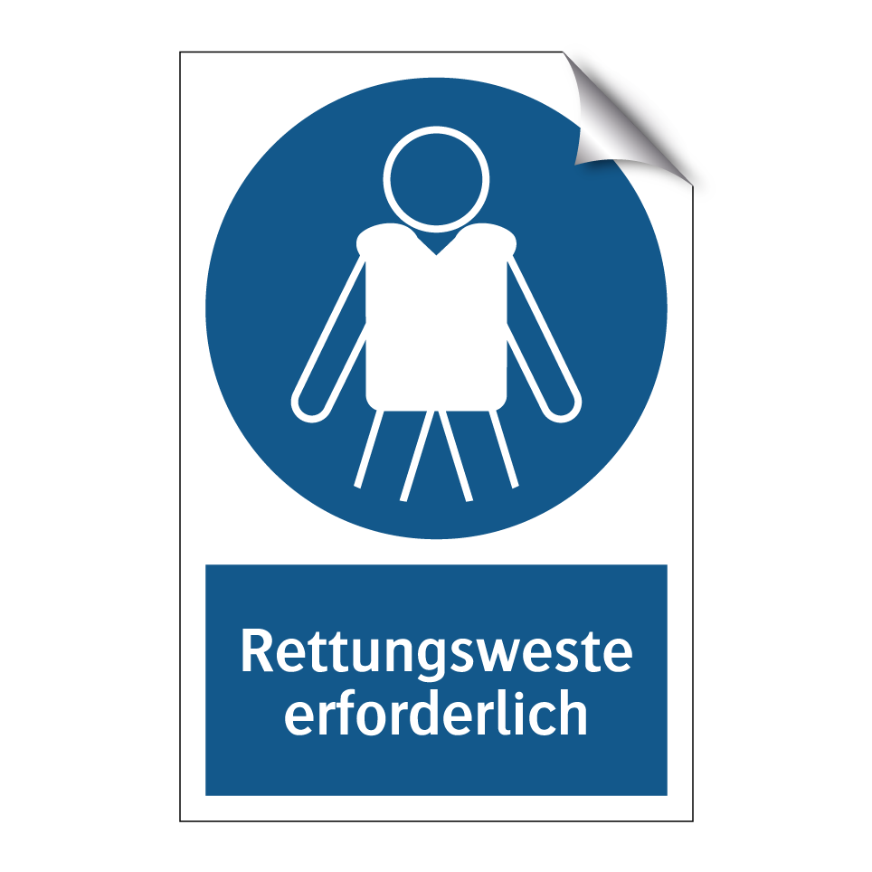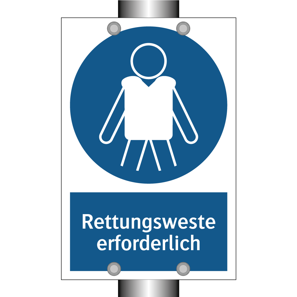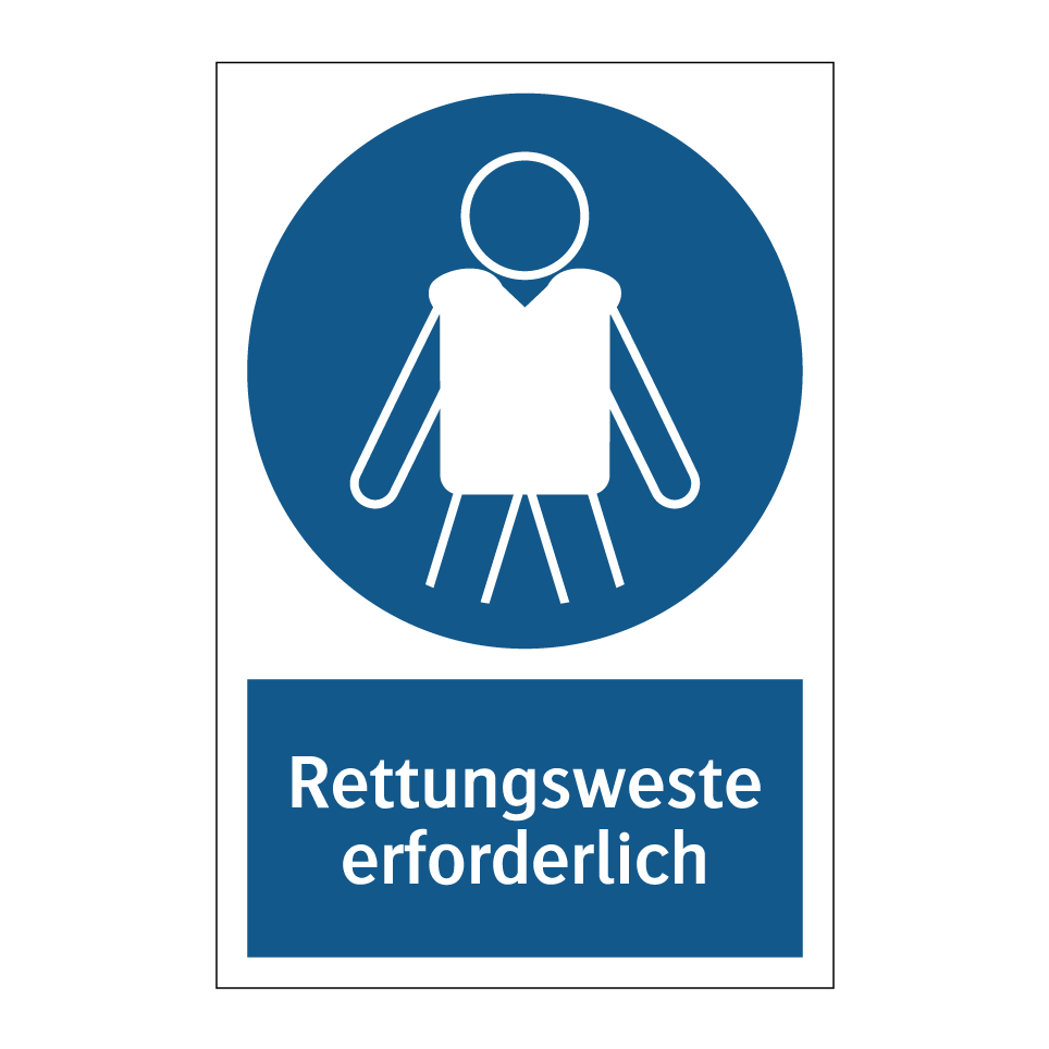 Gebotsschild mit dem Text Rettungsweste erforderlich