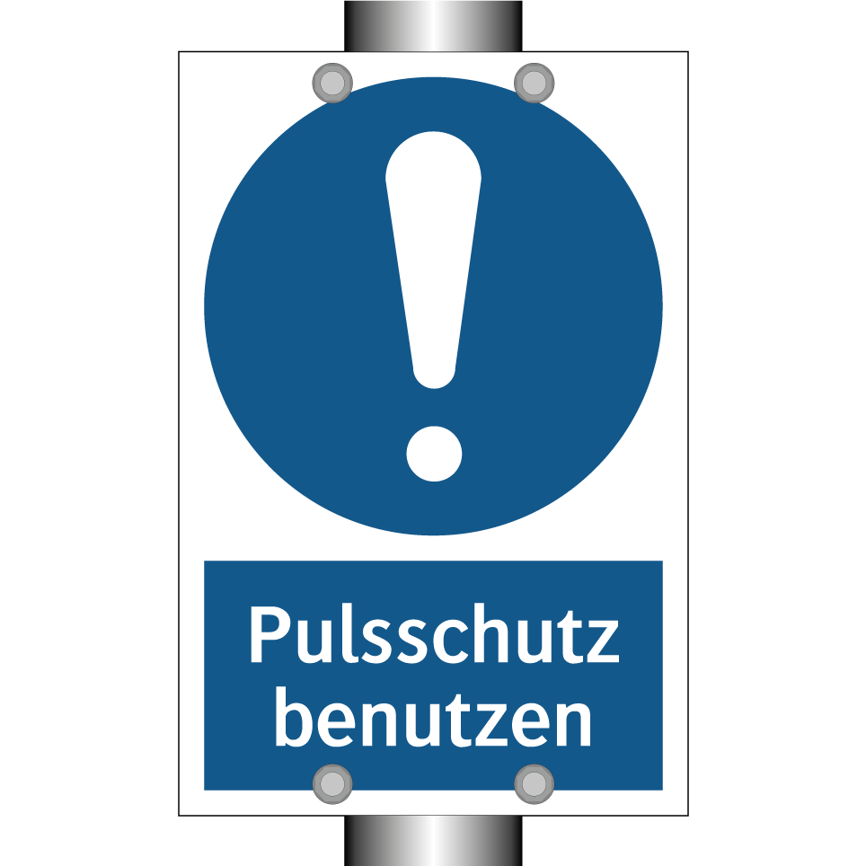 Gebotsschild mit dem Text Pulsschutz benutzen