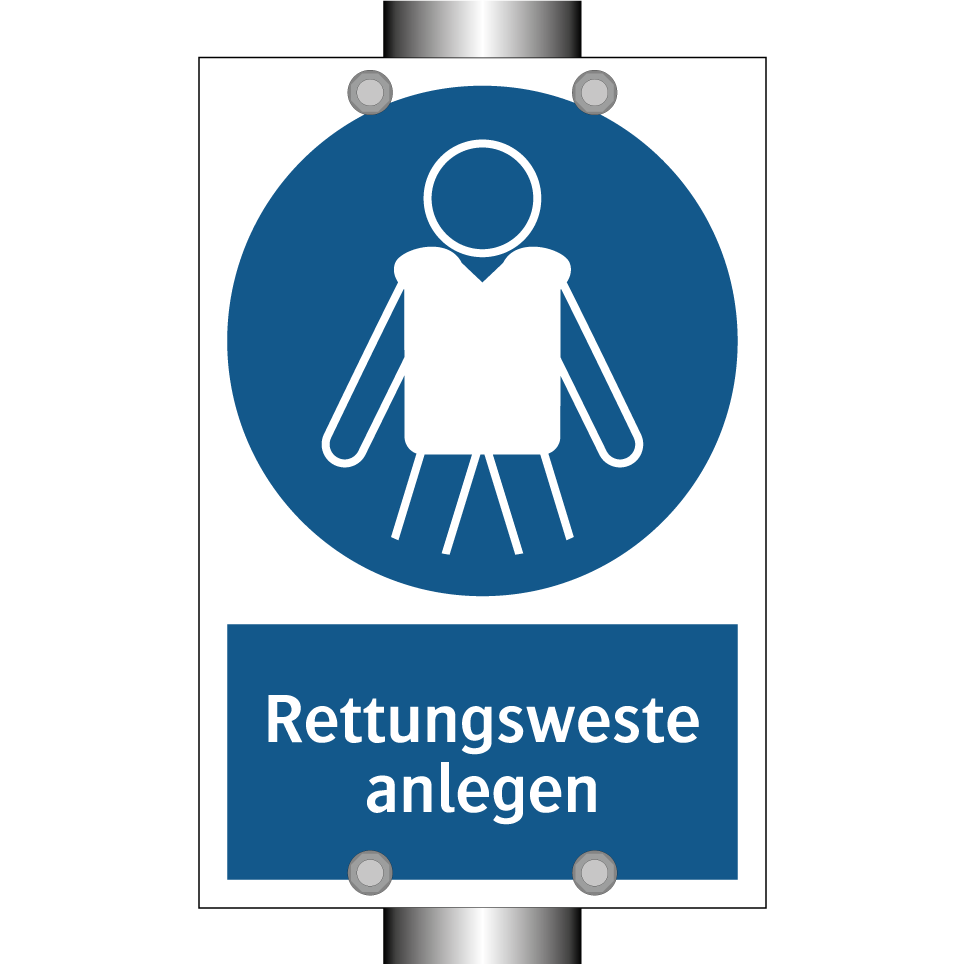 Gebotsschild mit dem Text Rettungsweste anlegen