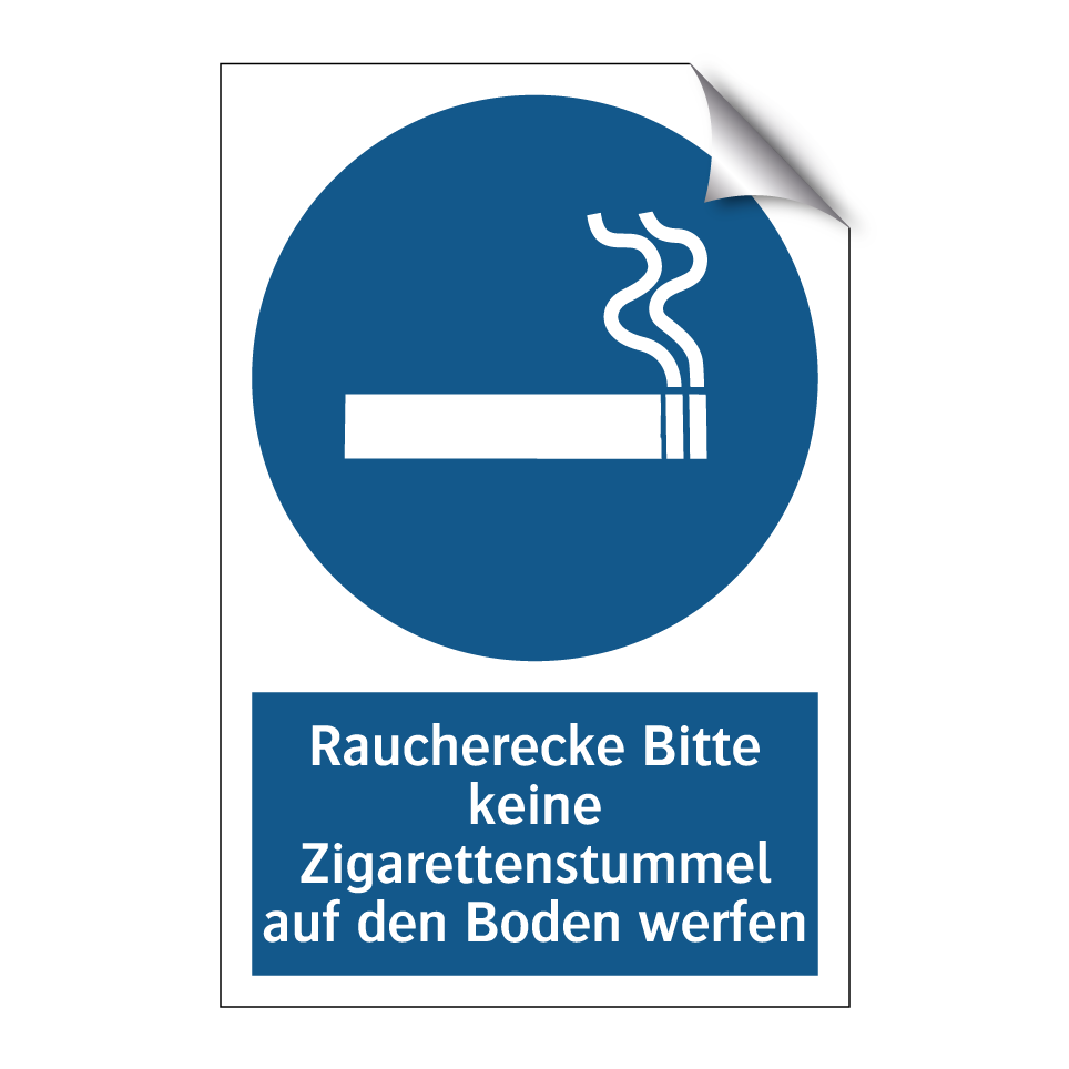 Gebotsschild mit dem Text Raucherecke Bitte keine Zigarettenstummel auf den Boden werfen