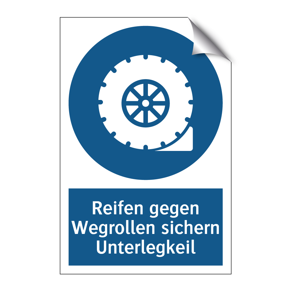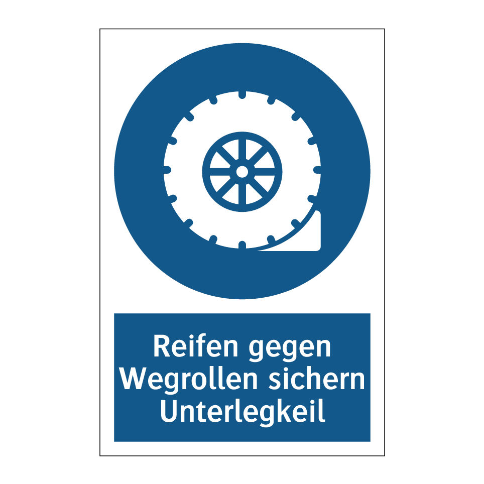 Gebotsschild mit dem Text Reifen gegen Wegrollen sichern Unterlegkeil