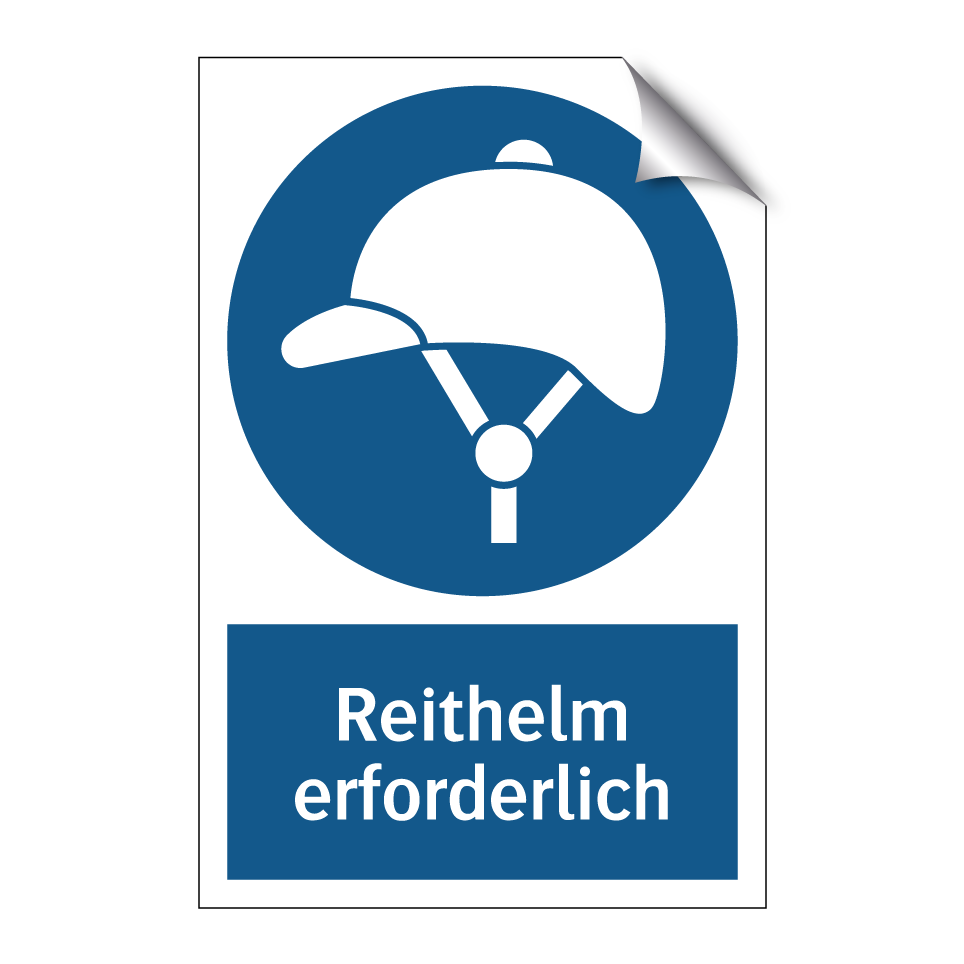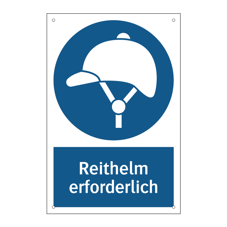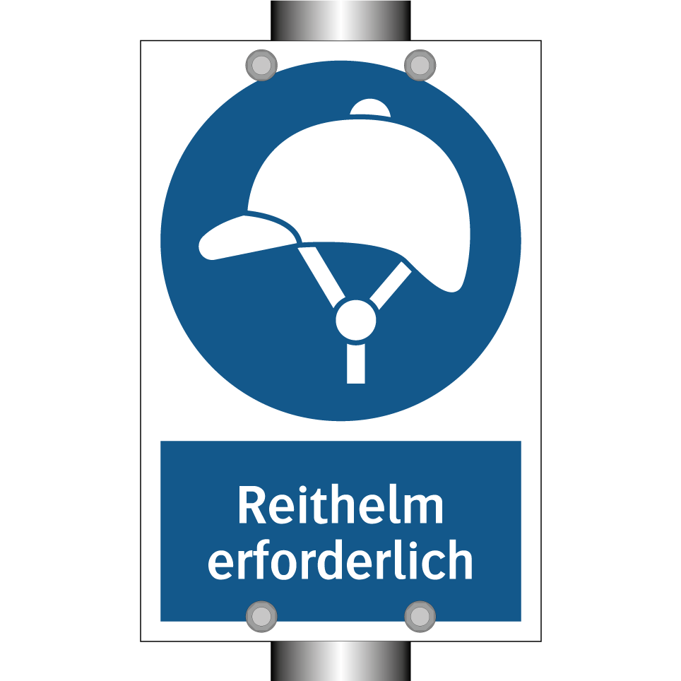 Gebotsschild mit dem Text Reithelm erforderlich