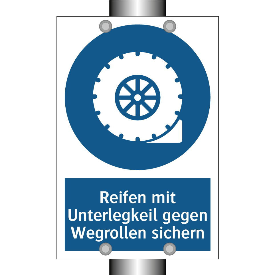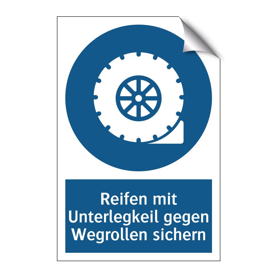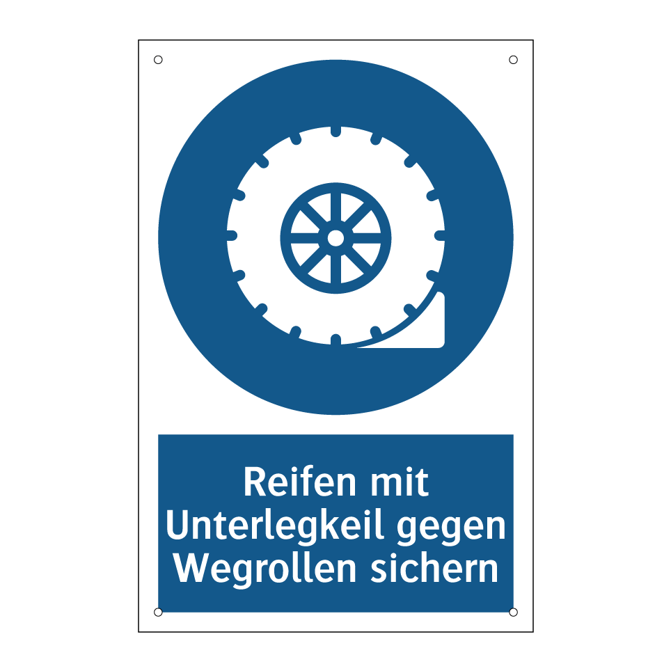Gebotsschild mit dem Text Reifen mit Unterlegkeil gegen Wegrollen sichern