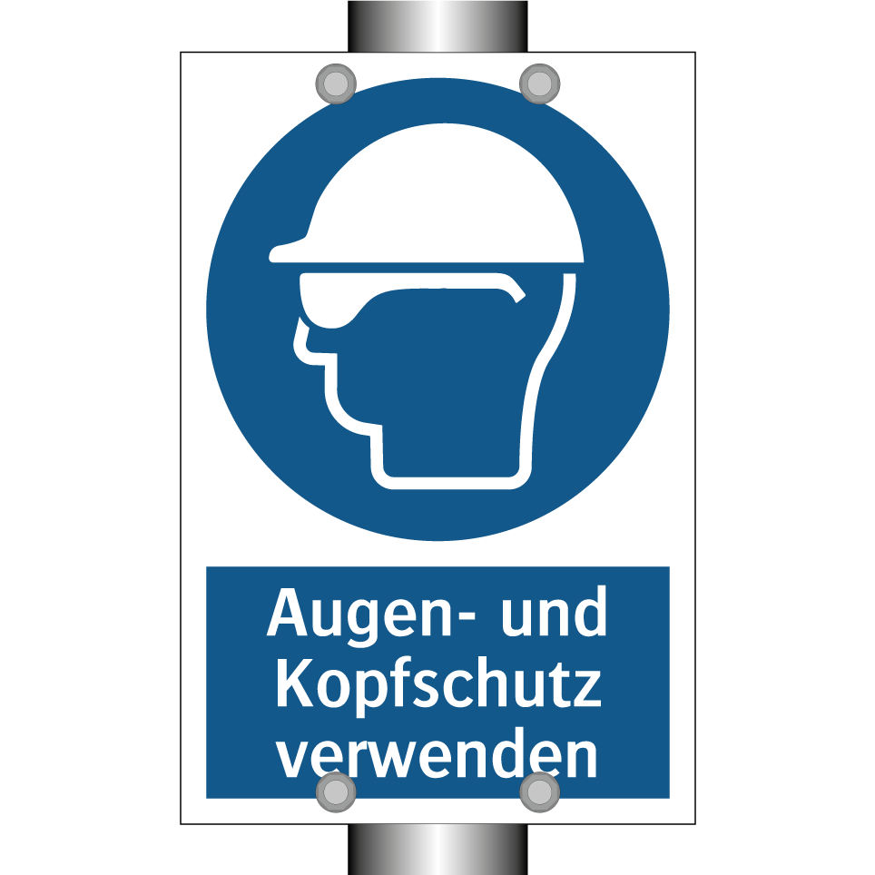 Gebotsschild mit dem Text Augen- und Kopfschutz verwenden