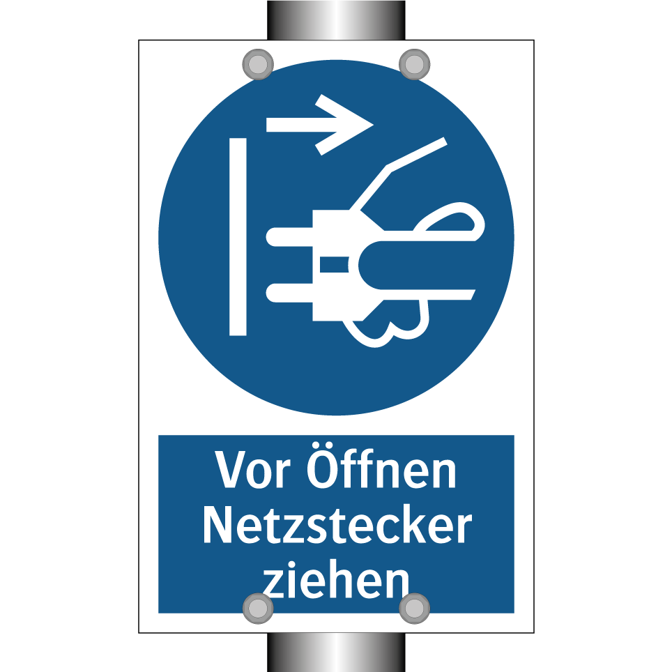 Gebotsschild mit dem Text Vor Öffnen Netzstecker ziehen