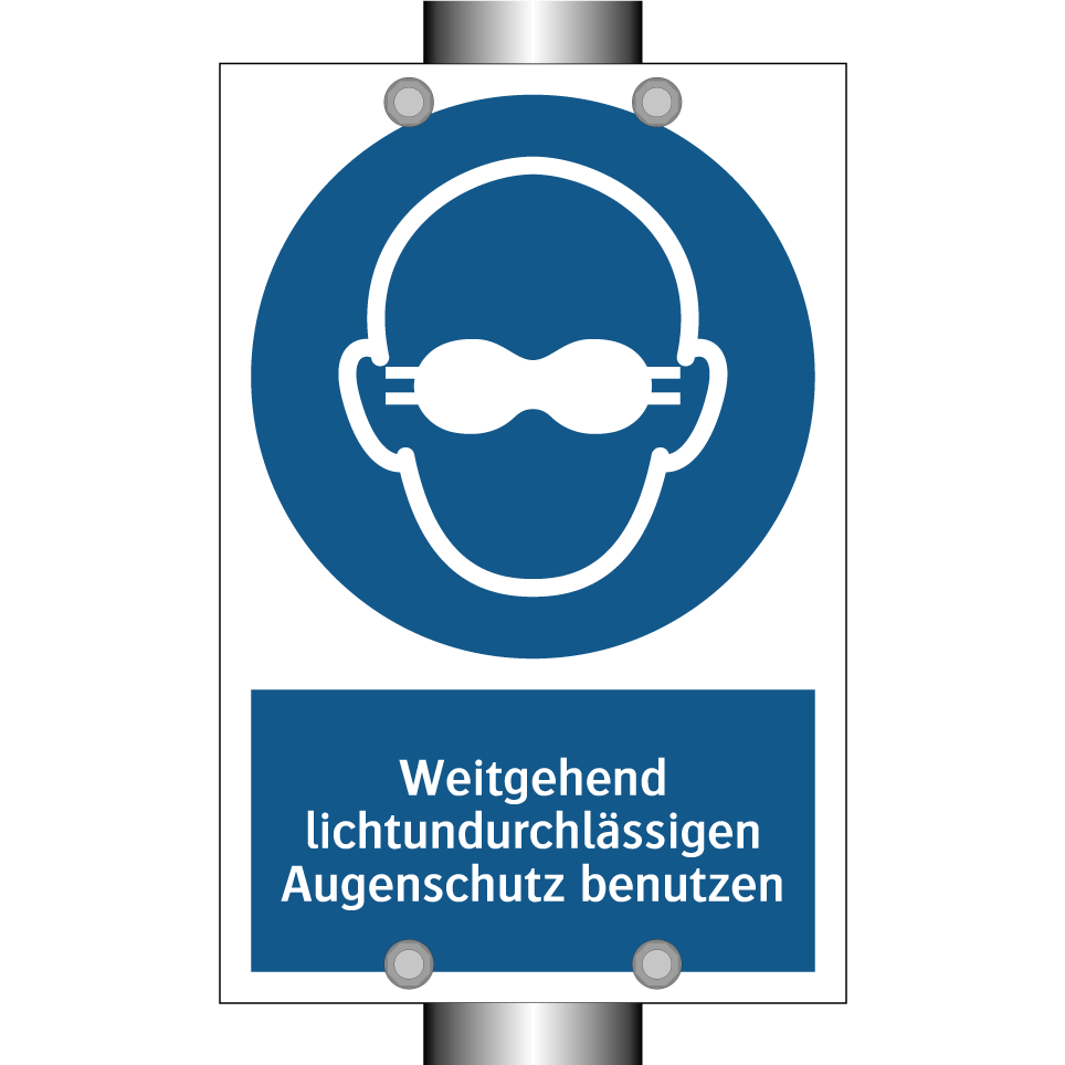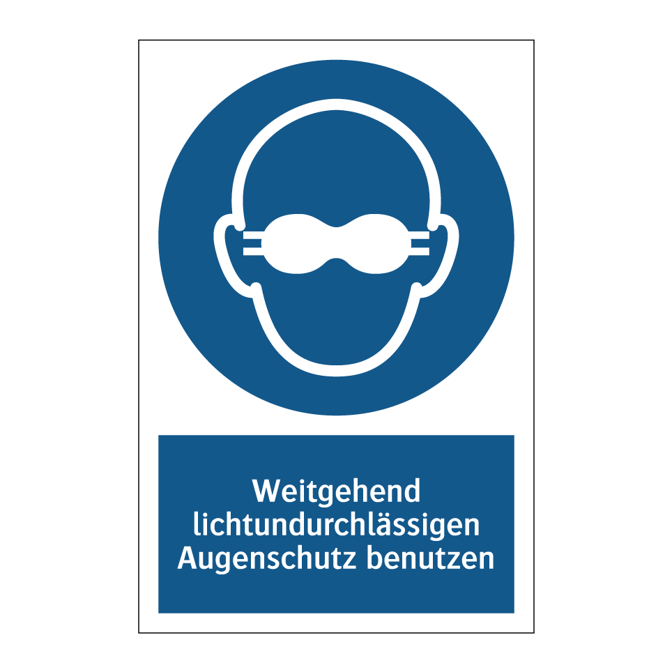Diese Gebotsschild mit blauem Hintergrund und weißer Schrift ist ideal für den Einsatz in Bereichen, in denen der Schutz der Augen oberste Priorität hat. Es erinnert daran, dass ein weitgehend lichtundurchlässiger Augenschutz getragen werden muss, um die Sicherheit zu gewährleisten. Diese Sicherheitsanweisung ist besonders wichtig in Umgebungen wie Werkstätten, Laboren oder Baustellen, wo intensive Lichtquellen oder gefährliche Materialien vorhanden sind. Platzieren Sie dieses Schild an gut sichtbaren Stellen, um sicherzustellen, dass alle Mitarbeiter und Besucher die Sicherheitsvorschriften einhalten. Die klare Symbolik und der prägnante Text machen es einfach, die Botschaft schnell zu erfassen und umzusetzen.