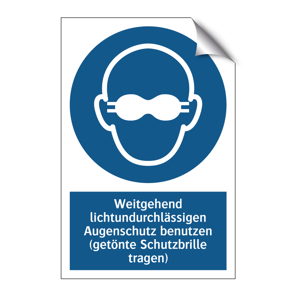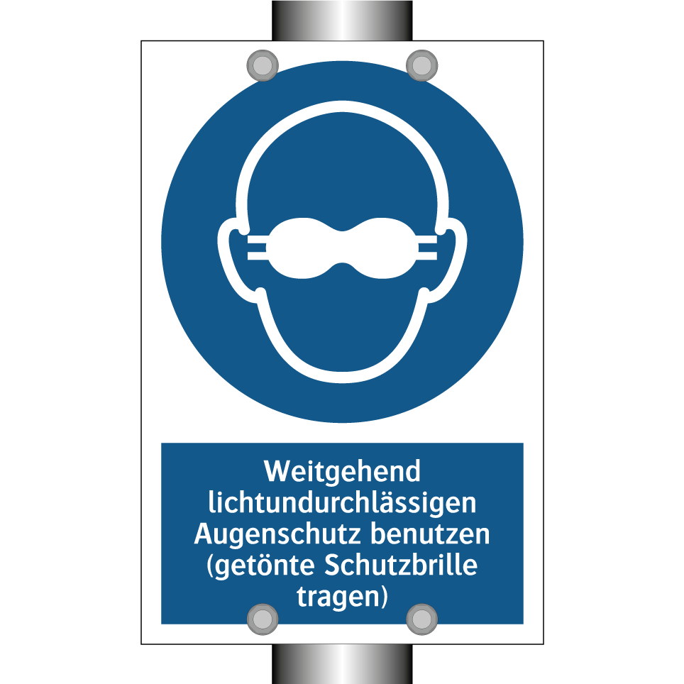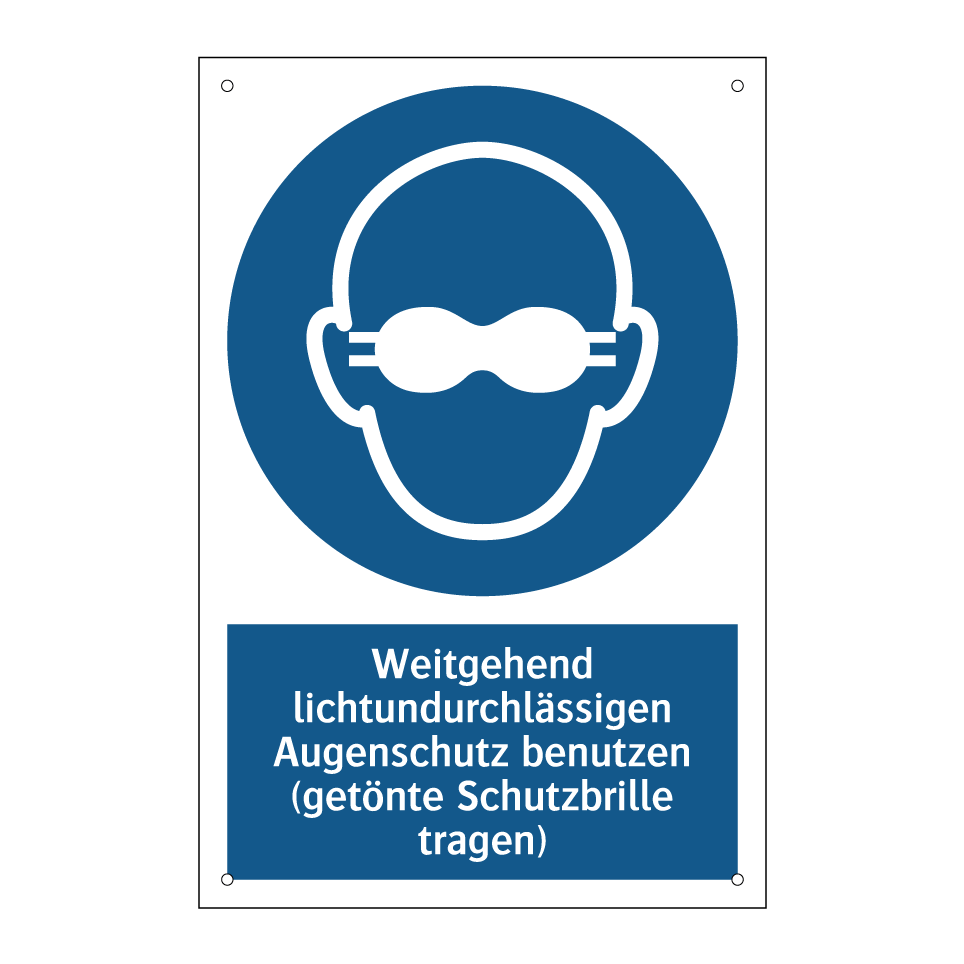 Gebotsschild mit dem Text Weitgehend lichtundurchlässigen Augenschutz benutzen (getönte Schutzbrille tragen)