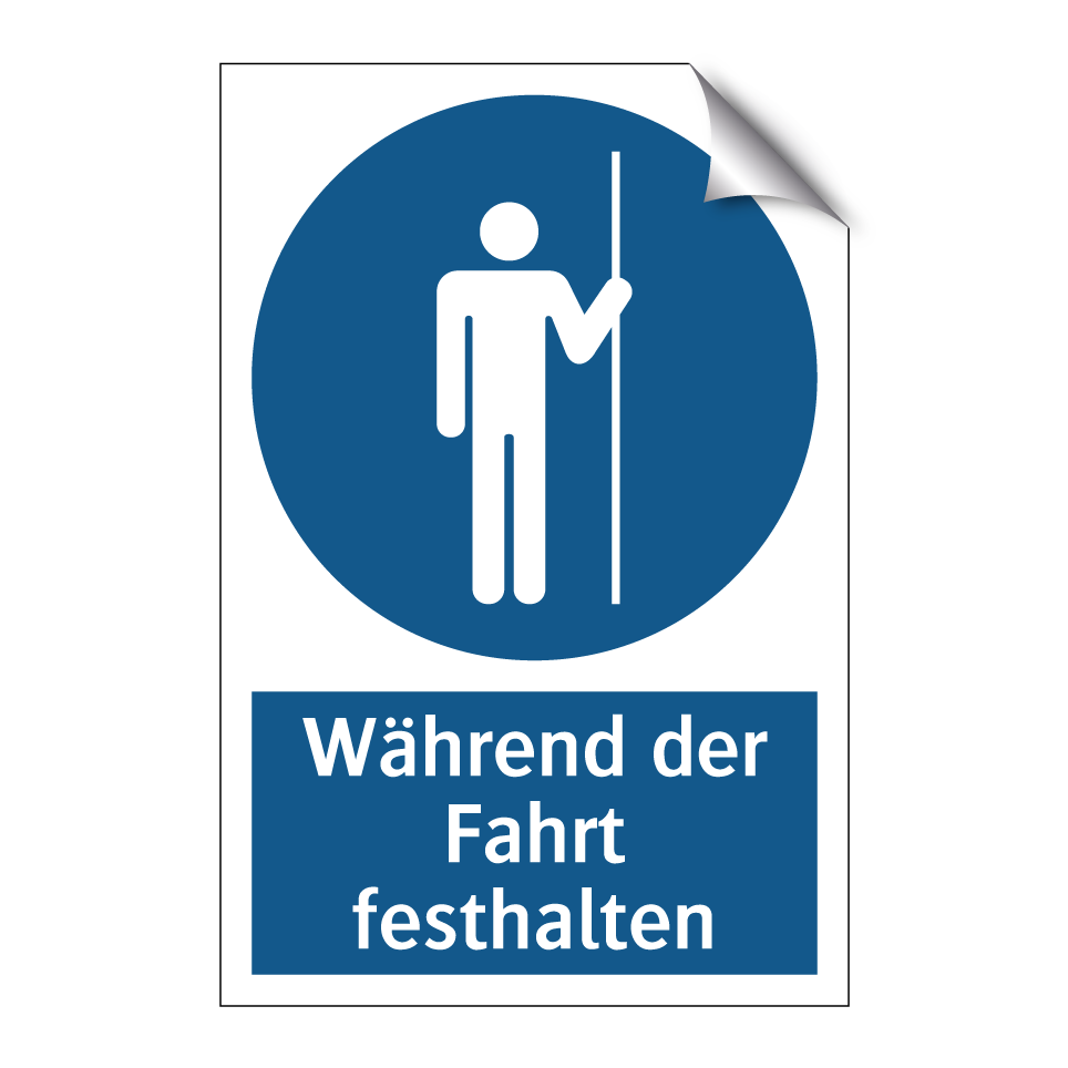 Gebotsschild mit dem Text Während der Fahrt festhalten