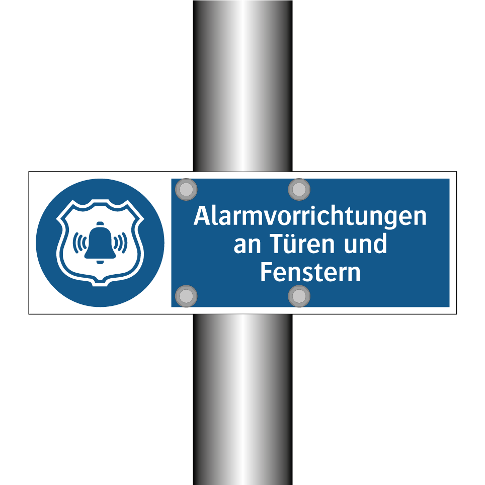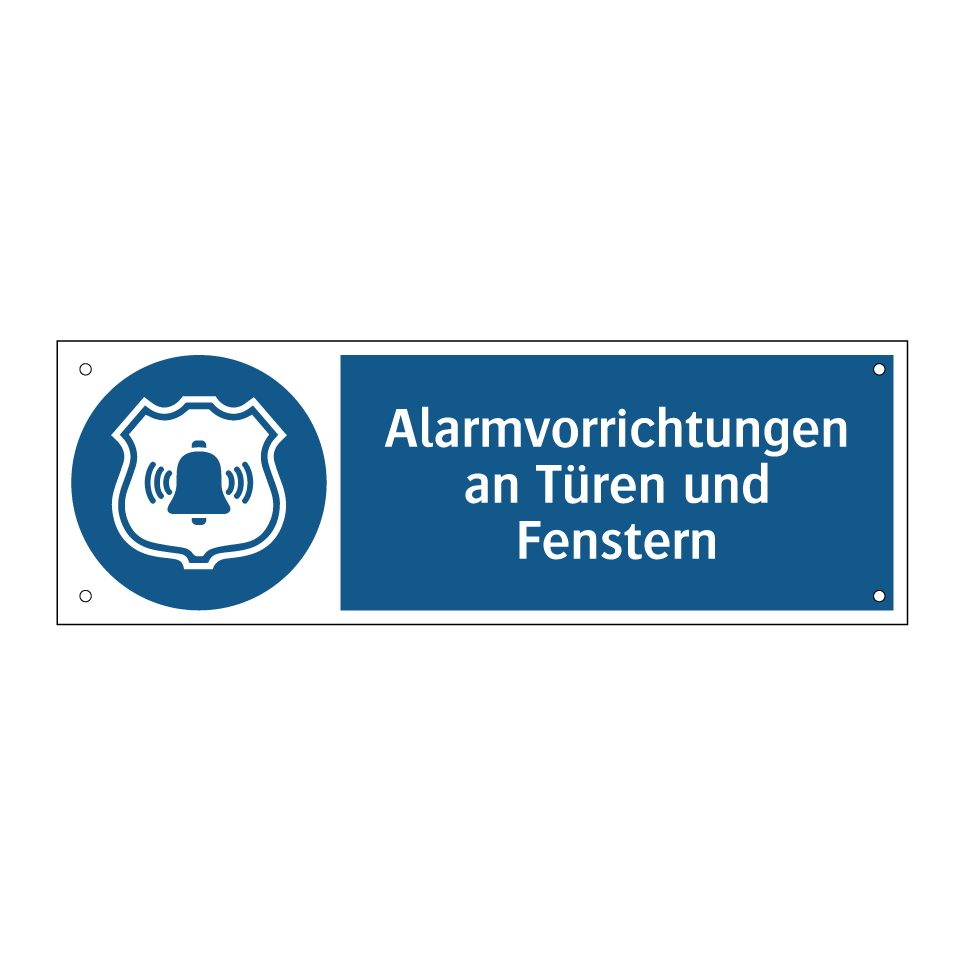 Gebotsschild mit dem Text Alarmvorrichtungen an Türen und Fenstern