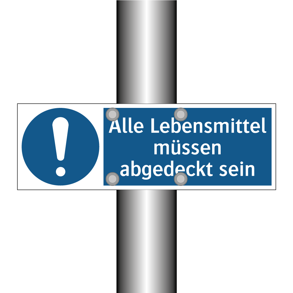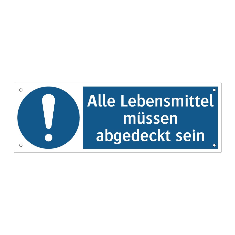 Diese Gebotsschild ist ideal für den Einsatz in Bereichen, in denen Hygiene oberste Priorität hat. Besonders geeignet für Küchen, Kantinen und Lebensmittelverarbeitungsbetriebe, sorgt sie dafür, dass alle Nahrungsmittel stets abgedeckt sind. Durch ihre klare blaue Hintergrundfarbe und die auffällige weiße Schrift mit Symbol wird die Botschaft unmissverständlich vermittelt. Platzieren Sie diese Gebotsschild an gut sichtbaren Stellen, um sicherzustellen, dass alle Mitarbeiter und Besucher die Hygienevorschriften einhalten. Diese visuelle Erinnerung trägt dazu bei, die Sauberkeit und Sicherheit in Ihrem Betrieb zu gewährleisten und fördert ein verantwortungsbewusstes Verhalten im Umgang mit Lebensmitteln.