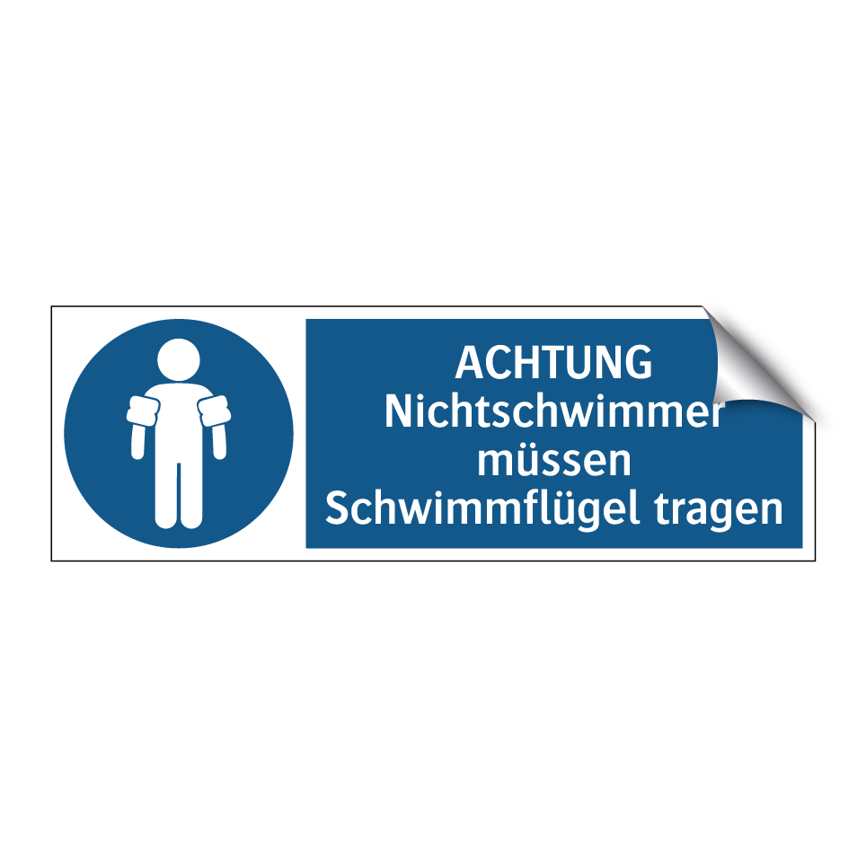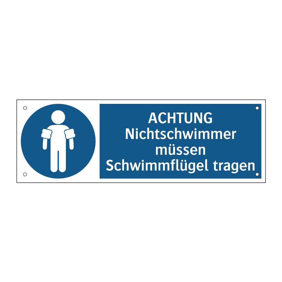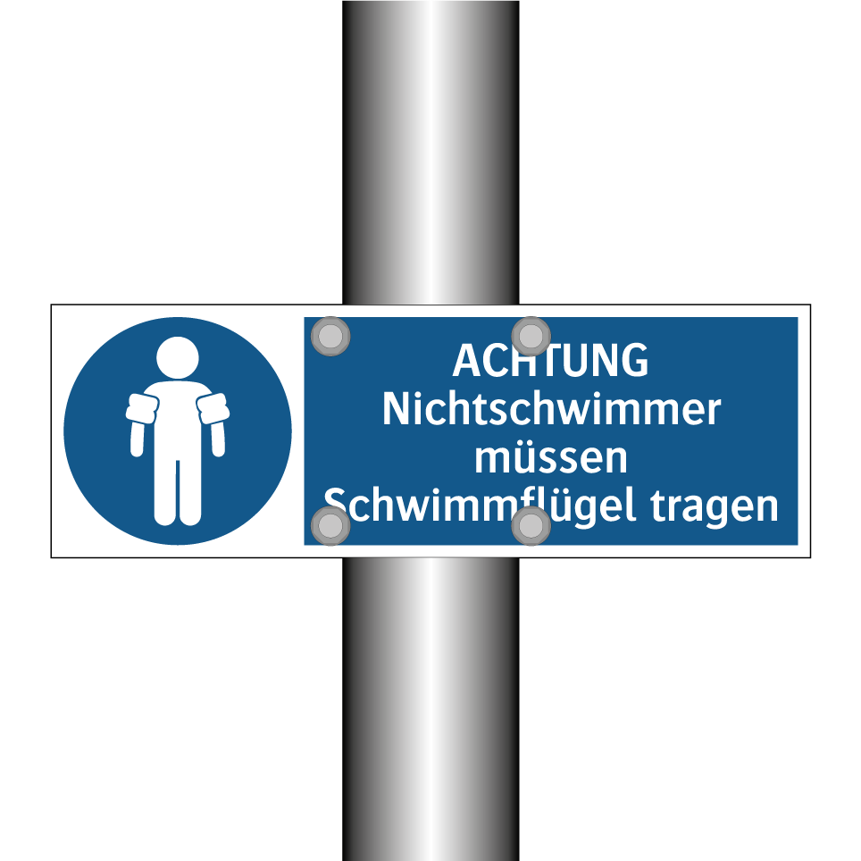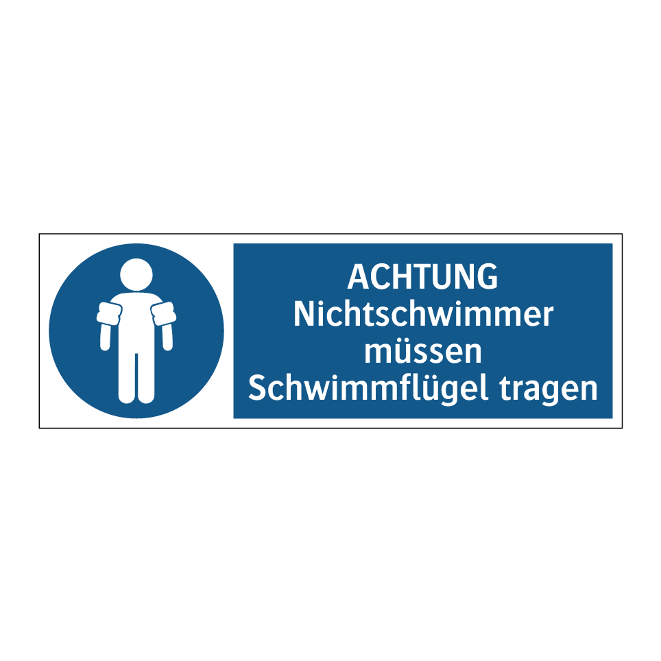 Gebotsschild mit dem Text ACHTUNG Nichtschwimmer müssen Schwimmflügel tragen